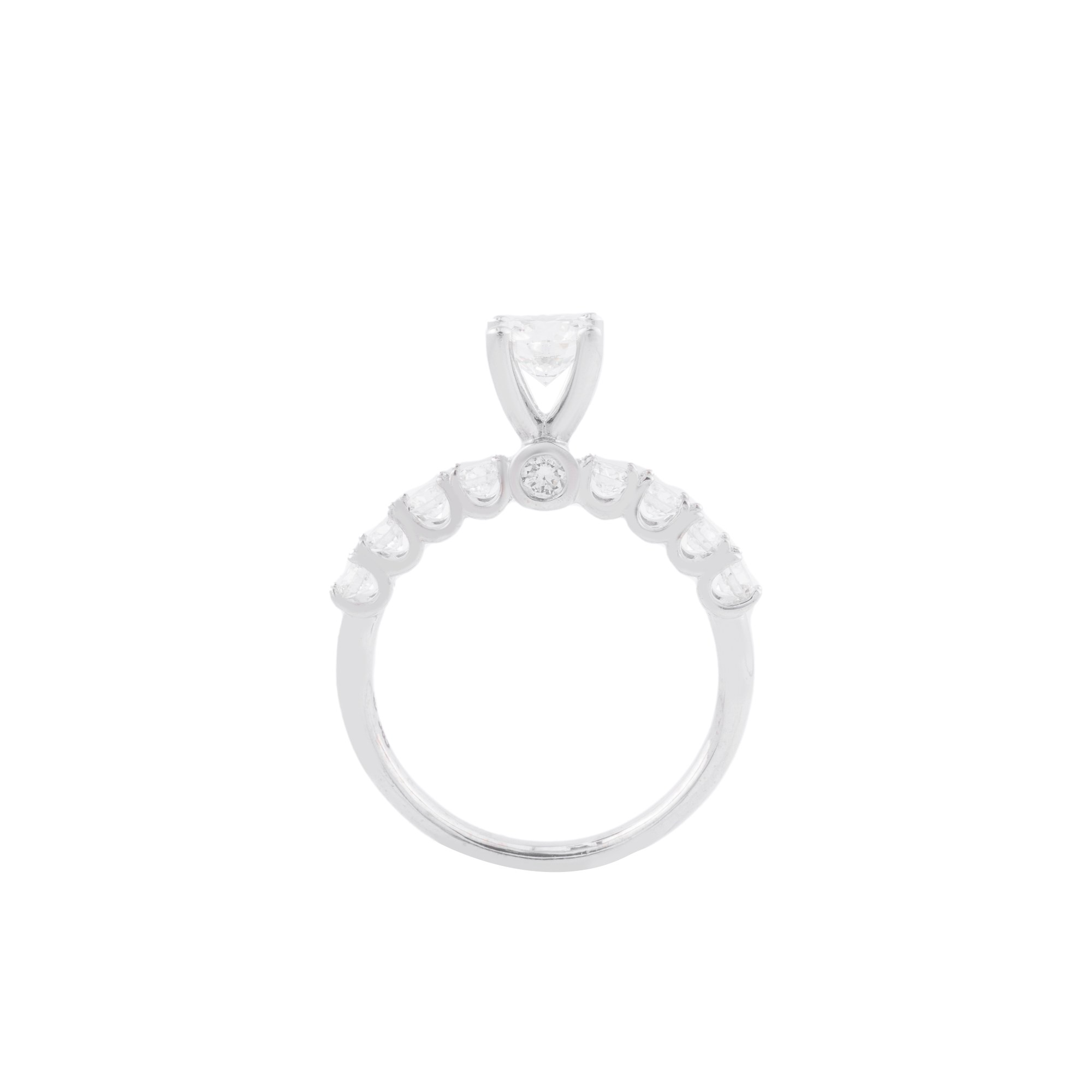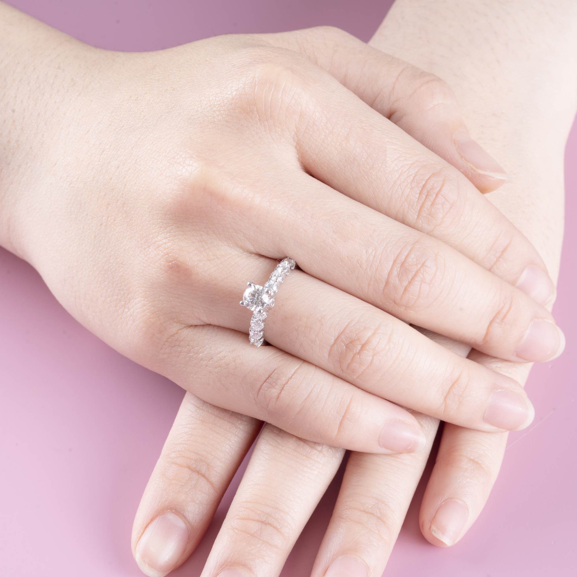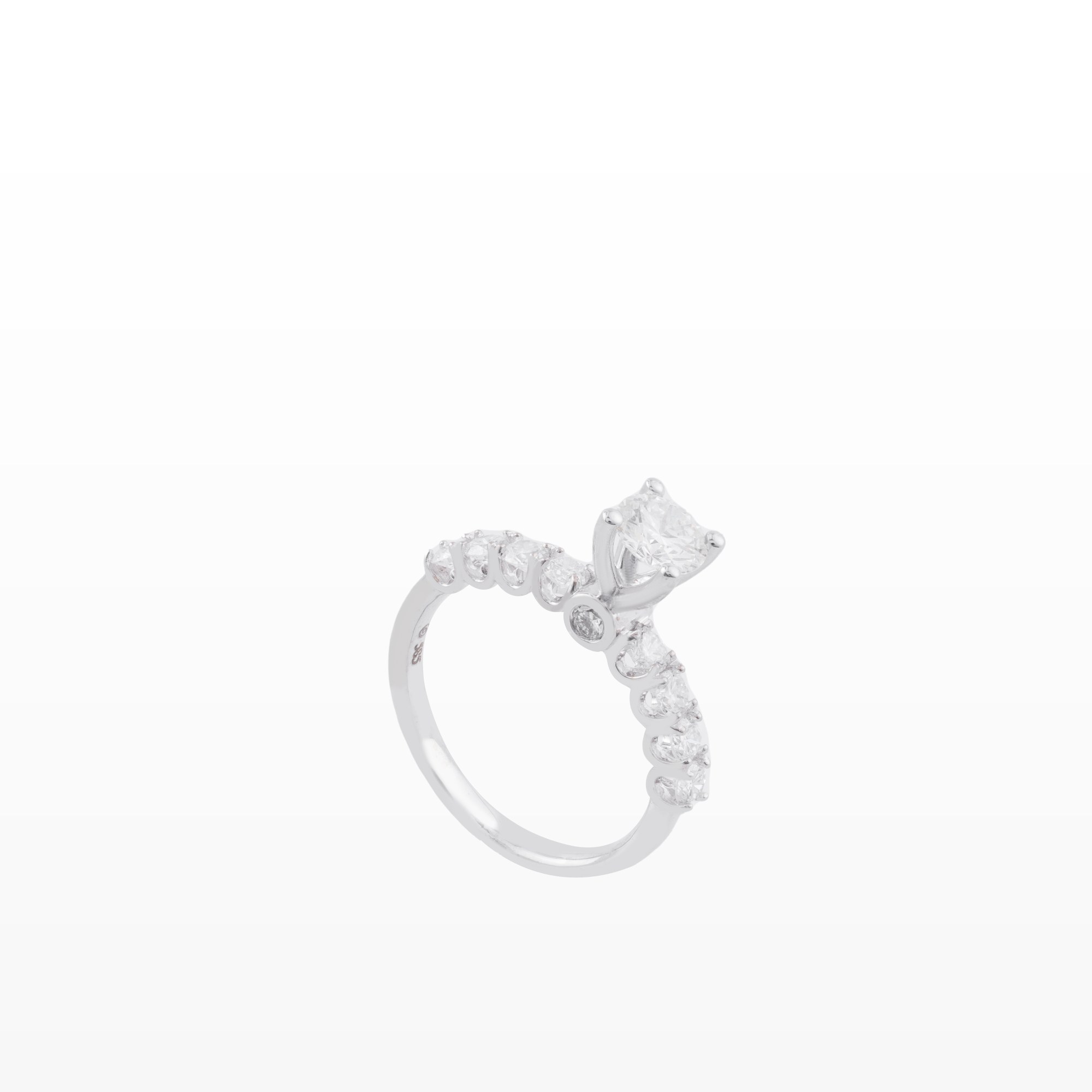 Chiếc nhẫn gây ấn tượng với viên kim cương chủ dáng vuông được đặt cao, tôn lên vẻ đẹp sắc sảo và hiện đại. Thiết kế chấu tinh tế giúp viên đón trọn ánh sáng, tạo nên hiệu ứng lấp lánh rực rỡ ở mọi góc nhìn.