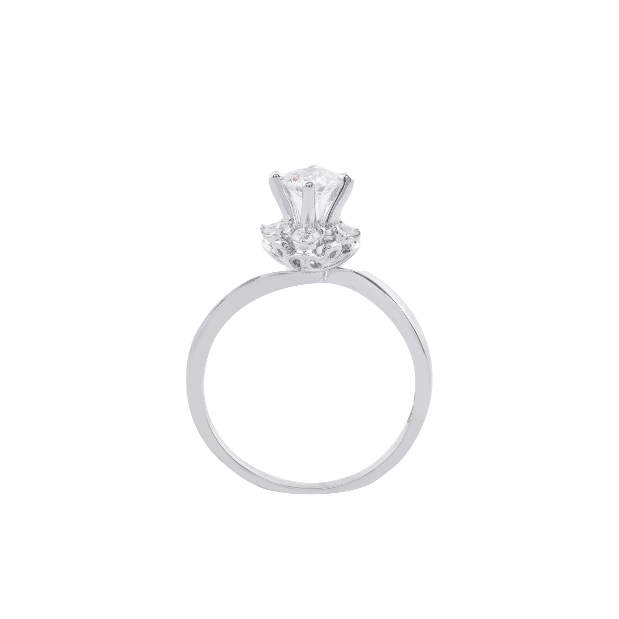 Nhẫn kim cương solitaire gây ấn tượng với thiết kế tinh tế và hiện đại, nổi bật bởi viên kim cương tròn rực rỡ được đặt trong ổ chấu vuông cách điệu độc đáo. Phần đai nhẫn uốn cong mềm mại, tạo cảm giác thanh thoát và tôn lên trọn vẹn vẻ đẹp của viên đá chủ.