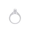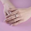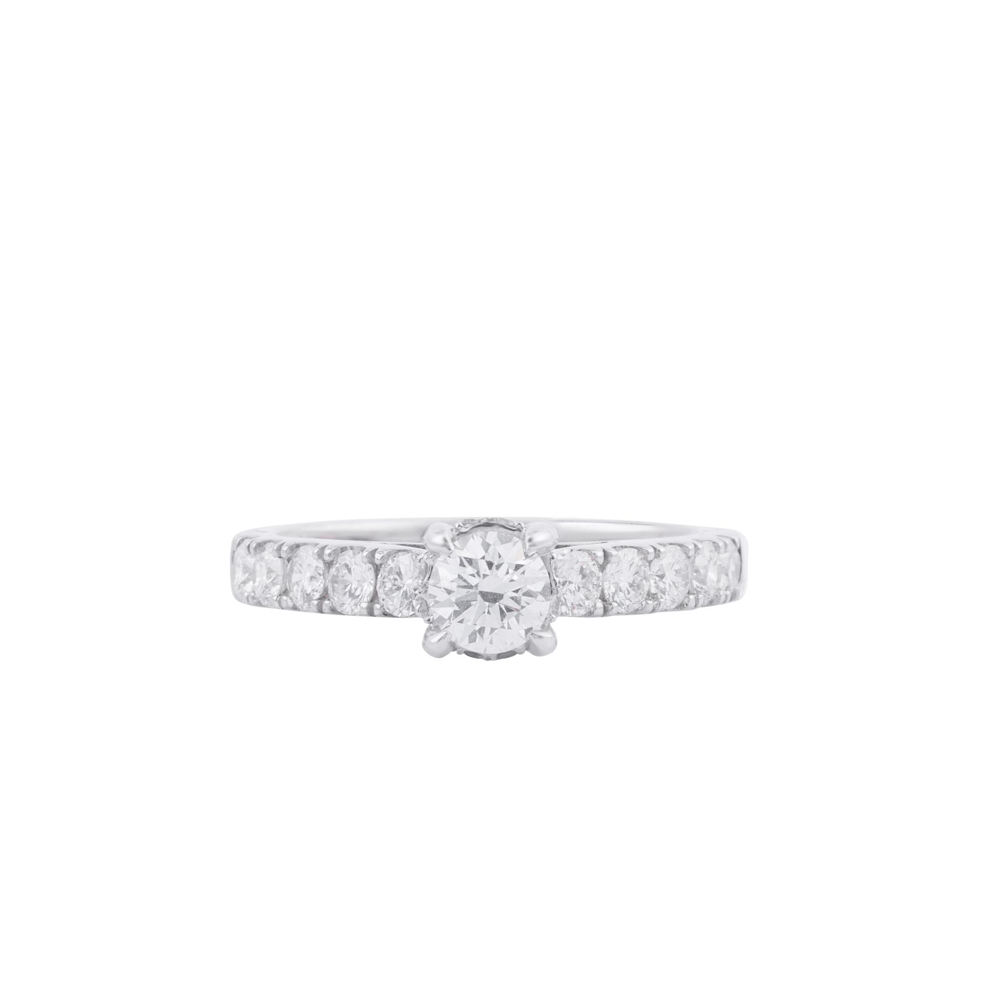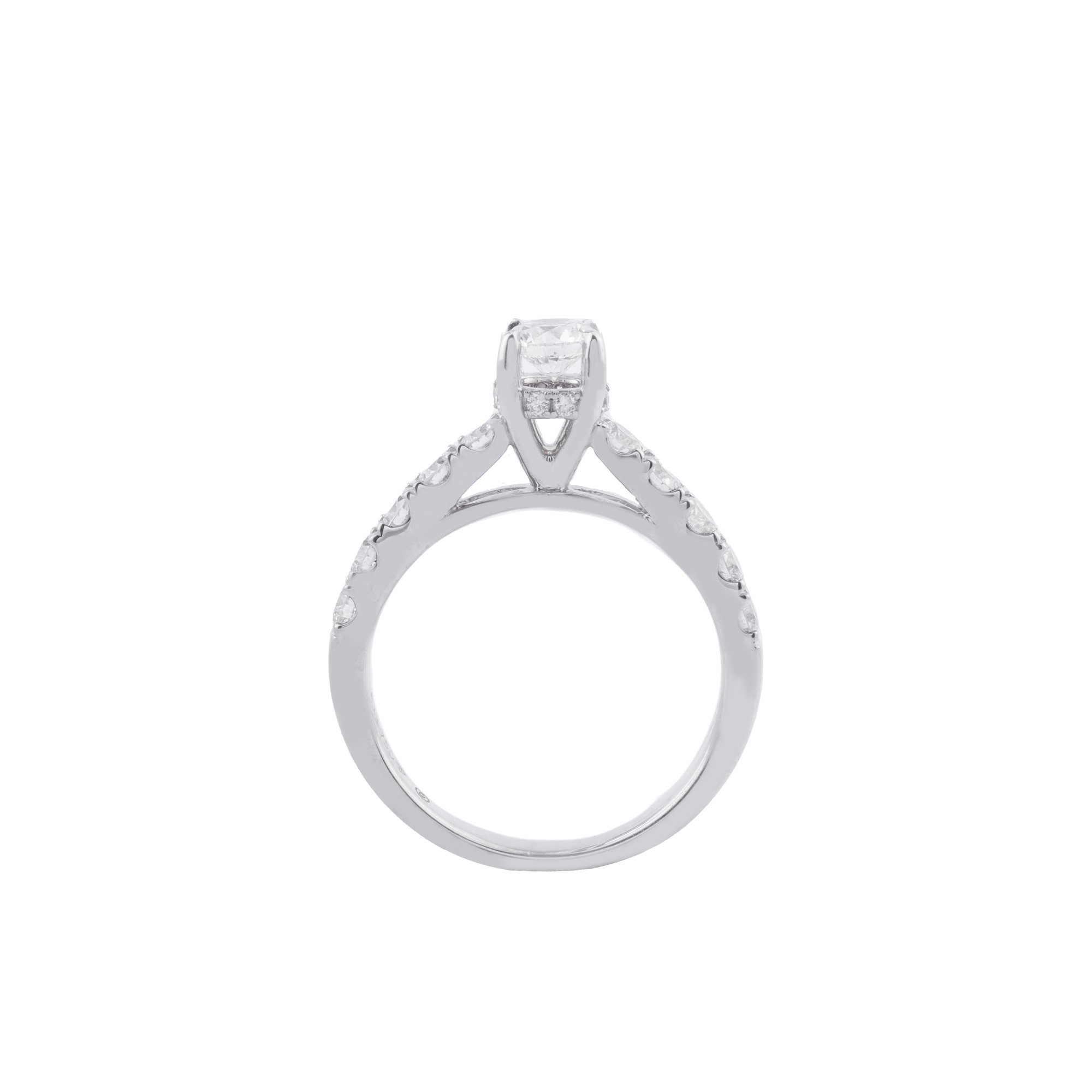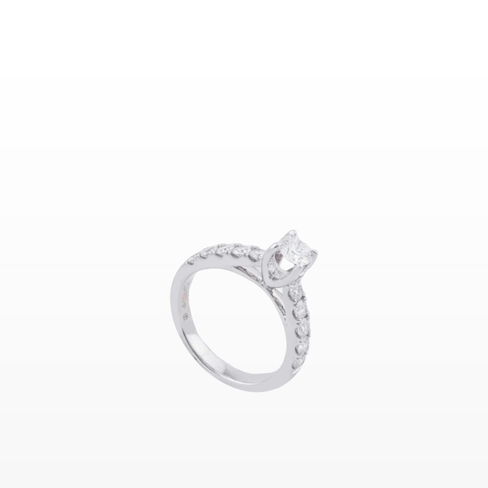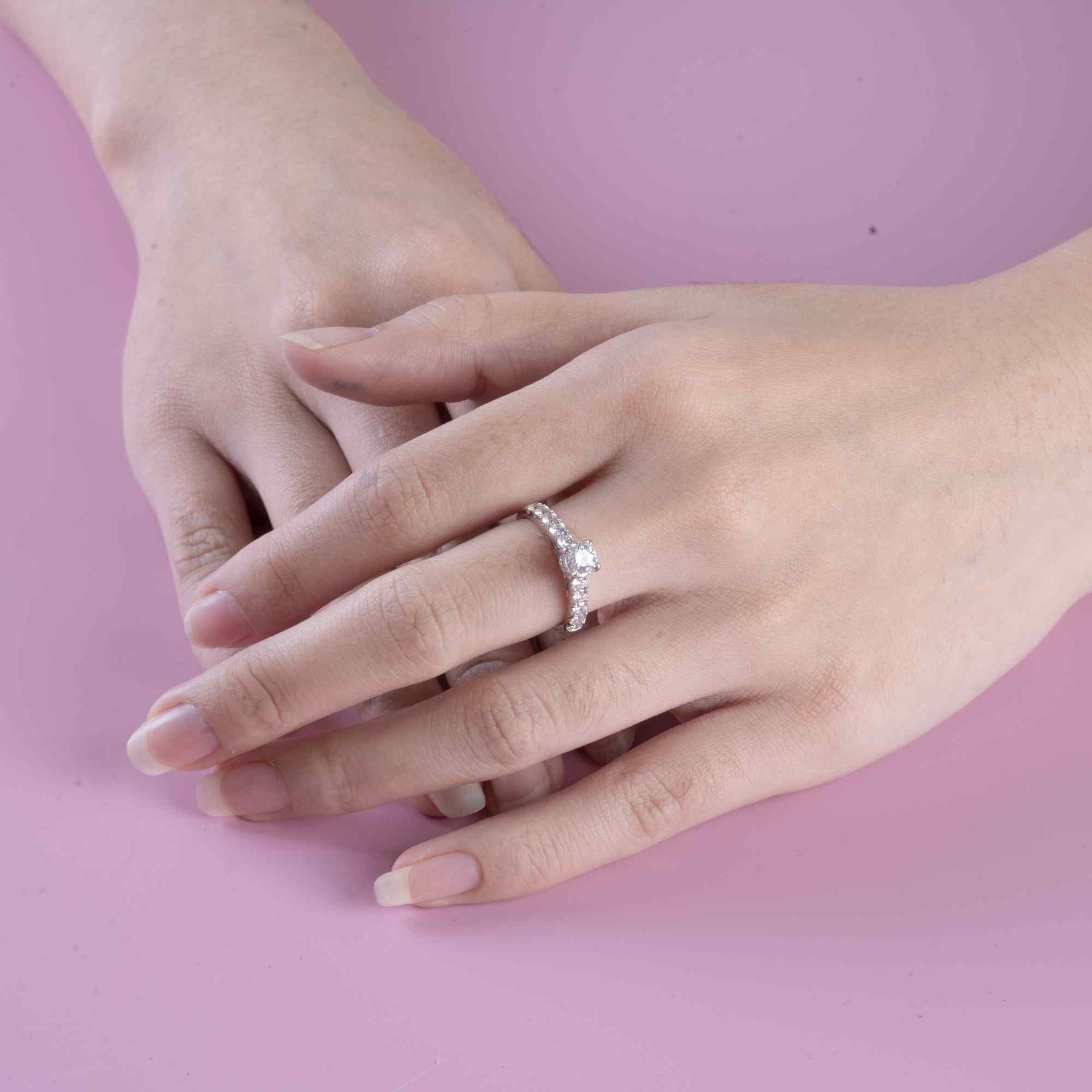 Nhẫn kim cương được thiết kế thanh lịch với viên kim cương chủ nổi bật ở trung tâm, tỏa sáng nhờ dáng ổ cao tinh xảo. Hai bên thân nhẫn được đính kim cương tấm đều đặn, tạo hiệu ứng lấp lánh liên tục khi di chuyển, làm nổi bật vẻ đẹp rạng rỡ của viên đá chính.