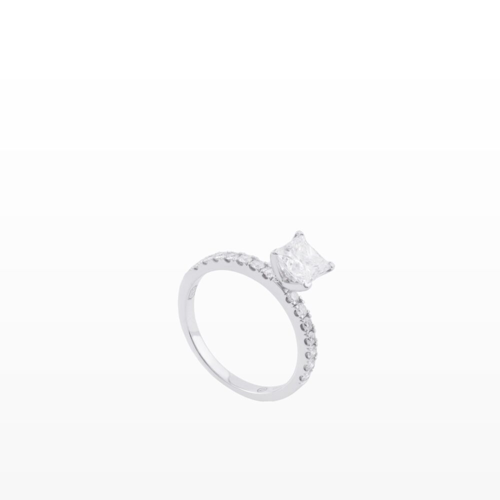 Chiếc nhẫn kim cương solitaire dáng vuông mang vẻ đẹp hiện đại và đầy cuốn hút. Viên kim cương trung tâm được cắt vuông nổi bật, tôn lên độ sáng và sự sắc nét tinh xảo. Phần thân nhẫn đính kim cương dọc hai bên tạo hiệu ứng lấp lánh liên tục, giúp tổng thể thêm phần sang trọng.