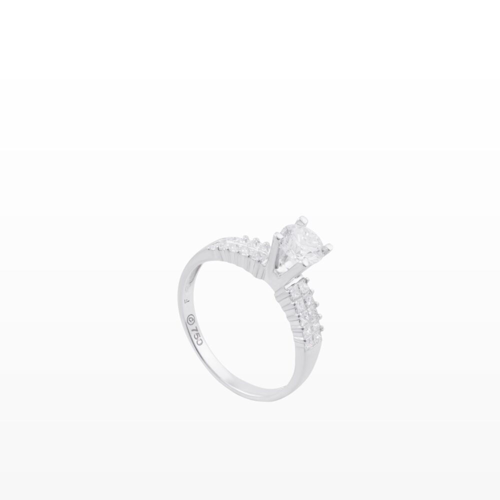 Viên kim cương trung tâm được nâng cao nổi bật, kết hợp cùng phần thân nhẫn đính kim cương nhiều tầng tạo hiệu ứng lấp lánh rực rỡ như một chiếc vương miện thu nhỏ. Thiết kế vừa tinh xảo vừa cuốn hút, tôn lên khí chất kiêu hãnh và đẳng cấp của người đeo.