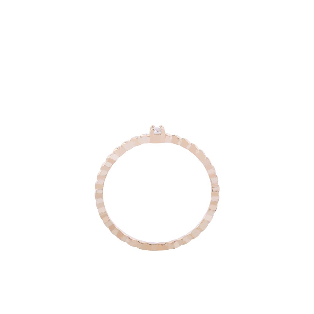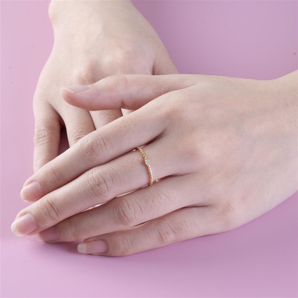 Điểm nhấn là viên kim cương lấp lánh e ấp trên đỉnh nhẫn, được nâng đỡ bởi những chấu thanh mảnh. Ánh sáng phản chiếu nhẹ nhàng, lan tỏa nét quyến rũ tinh tế – không phô trương, mà cuốn hút theo cách rất riêng, rất gần.