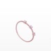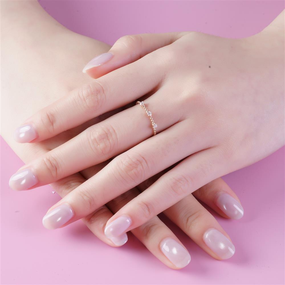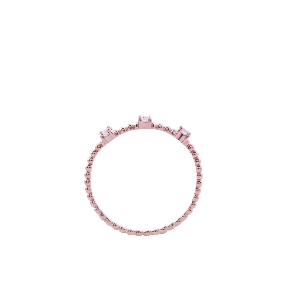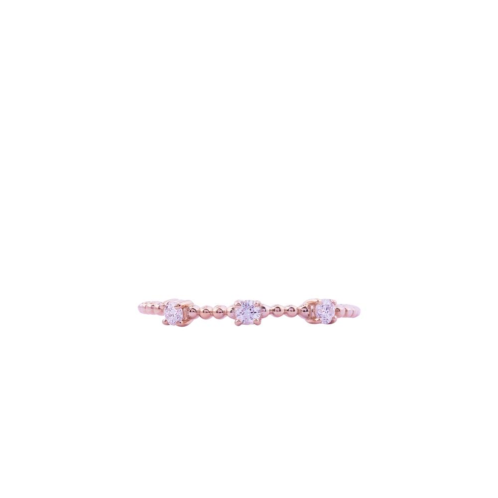 Nhẫn kim cương thiết kế dạng bi tròn chạy dọc thân nhẫn, tạo cảm giác mềm mại và hiện đại. Ba viên kim cương được sắp xếp tinh tế như những điểm sáng cân bằng, tượng trưng cho quá khứ – hiện tại – tương lai. Sắc vàng hồng mang đến vẻ nữ tính, thanh lịch, phù hợp đeo hằng ngày hoặc phối layer cùng nhẫn trơn.