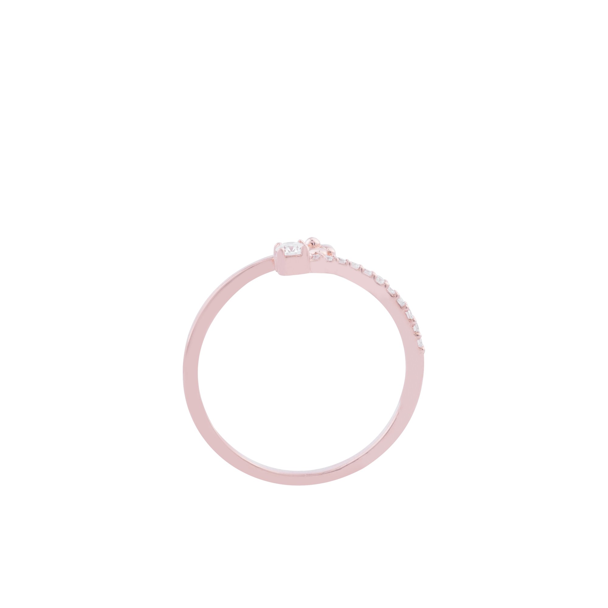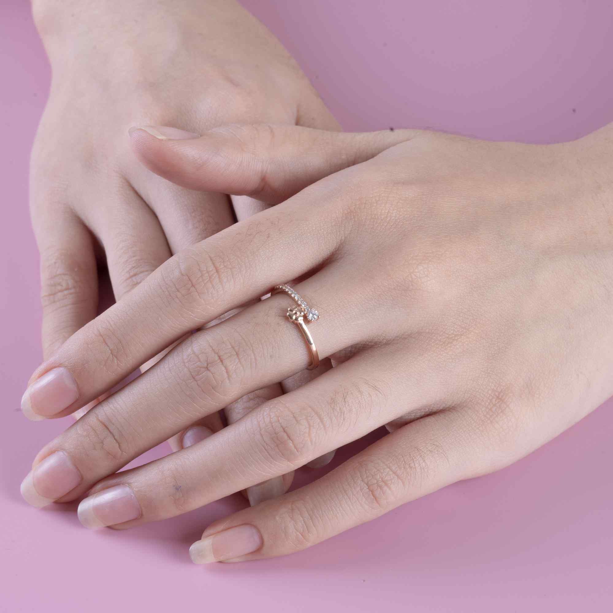 Thiết kế nhẫn độc đáo với hai điểm nhấn tinh tế: một viên kim cương solitaire rực rỡ kết hợp cùng họa tiết hoa nhỏ mềm mại, tạo nên vẻ đẹp hài hòa giữa ánh sáng và cảm xúc. Dải kim cương đính dọc thân nhẫn giúp tổng thể thêm phần lấp lánh, như những khoảnh khắc yêu thương được nâng niu và nối dài theo thời gian.