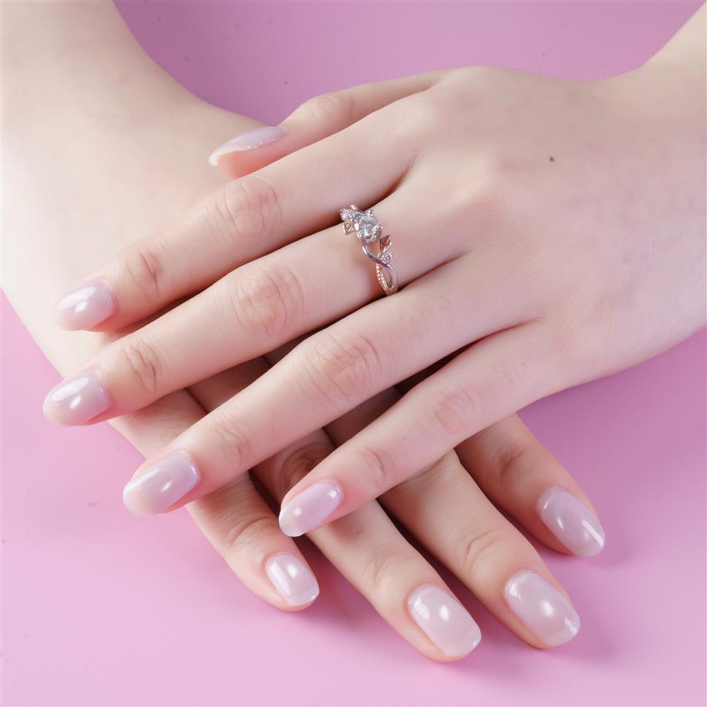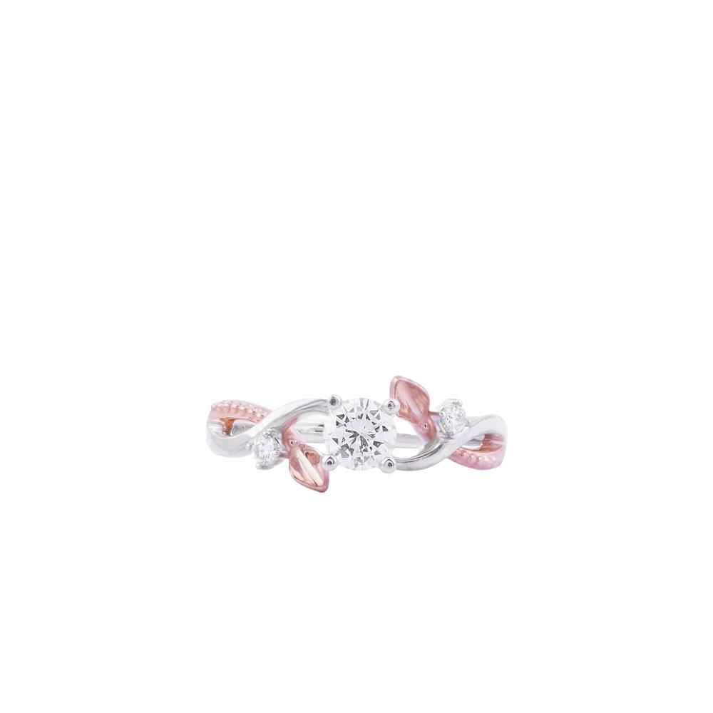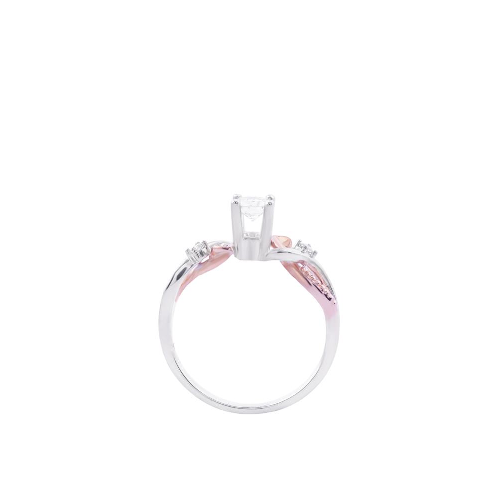 Nhẫn kim cương gây ấn tượng với thiết kế hai tông màu trắng – vàng hồng mềm mại, lấy cảm hứng từ hình ảnh ruy băng uốn lượn kết hợp cánh hoa tinh tế. Viên kim cương tròn ở trung tâm được đặt nổi bật, tượng trưng cho điểm sáng của tình yêu, được nâng niu bởi những đường cong uyển chuyển hai bên.