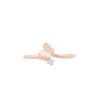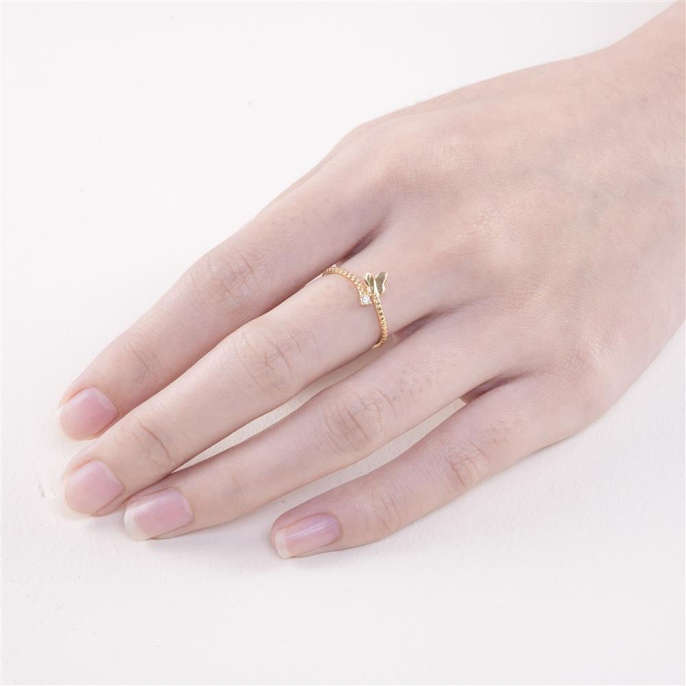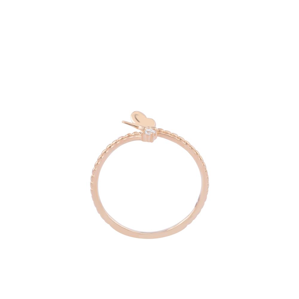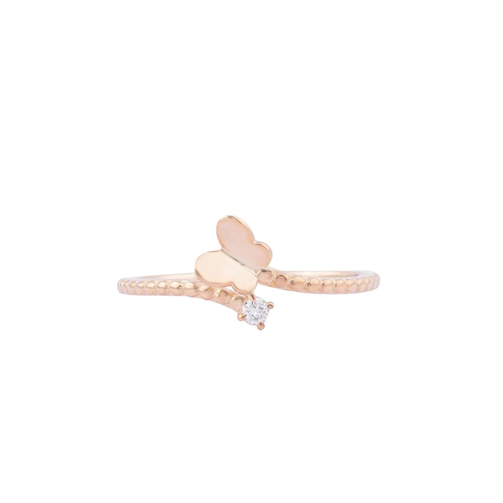 Điểm nhấn nổi bật là chú bướm nhỏ được tạo hình bay bổng, như đang khẽ đậu trên ngón tay. Kề bên là một viên kim cương tấm sáng trong, tượng trưng cho ánh sáng dẫn lối và vẻ đẹp thuần khiết. Khi ánh sáng chạm vào các giác cắt, viên kim cương lấp lánh nhẹ nhàng, khiến chiếc nhẫn trở nên sống động và cuốn hút hơn bao giờ hết.
