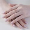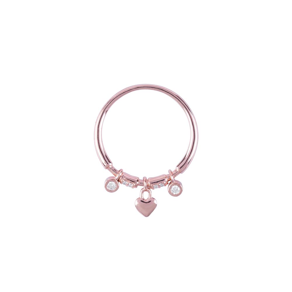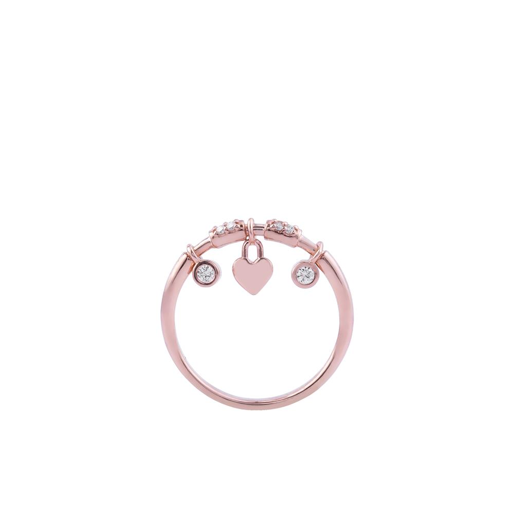 Nhẫn charm trái tim vàng hồng mang vẻ đẹp ngọt ngào và tinh tế, được thiết kế theo phong cách tối giản nhưng đầy cảm xúc. Điểm nhấn là charm trái tim nhỏ xinh ở trung tâm, kết hợp hai viên đá tròn lấp lánh hai bên, tạo nên tổng thể hài hòa và duyên dáng.