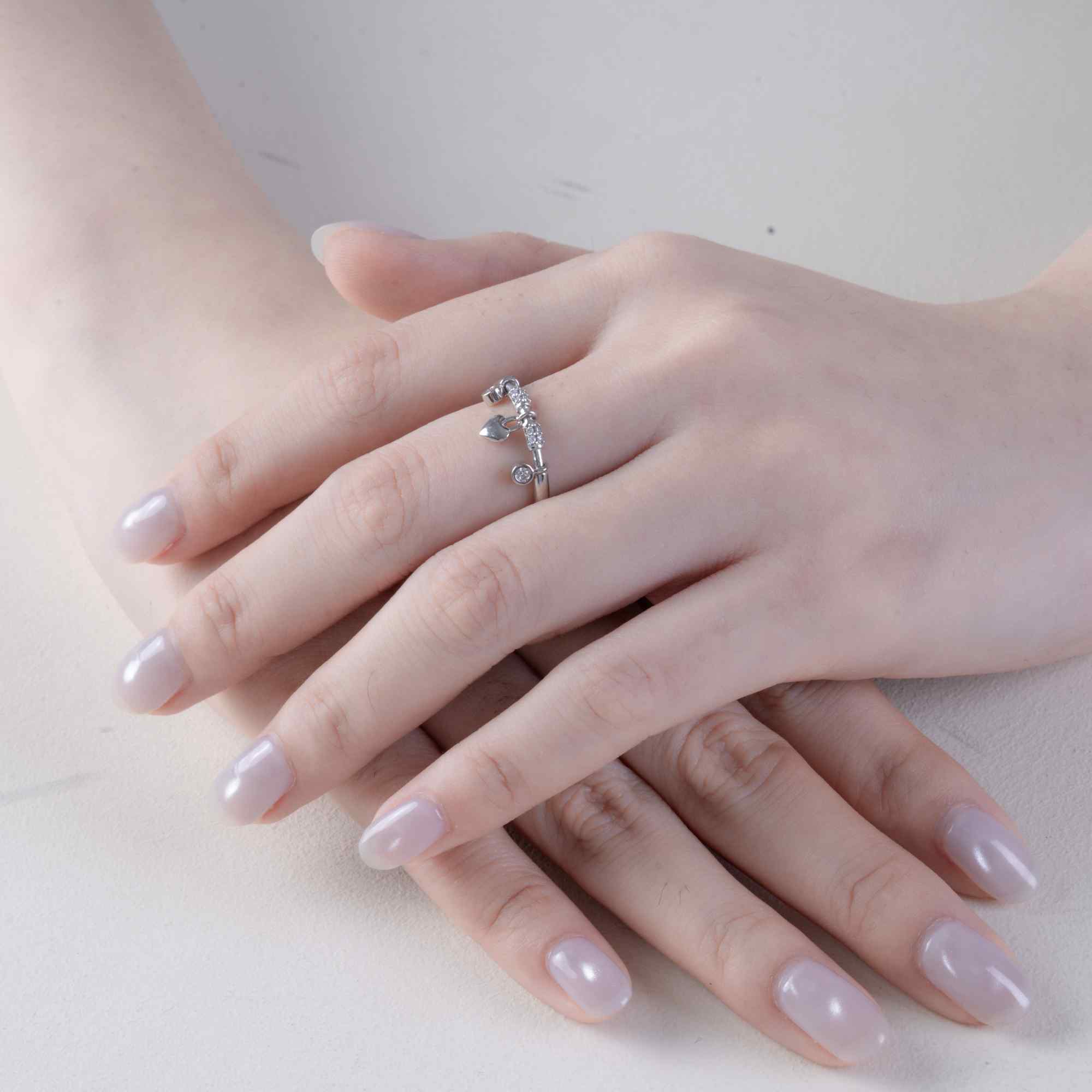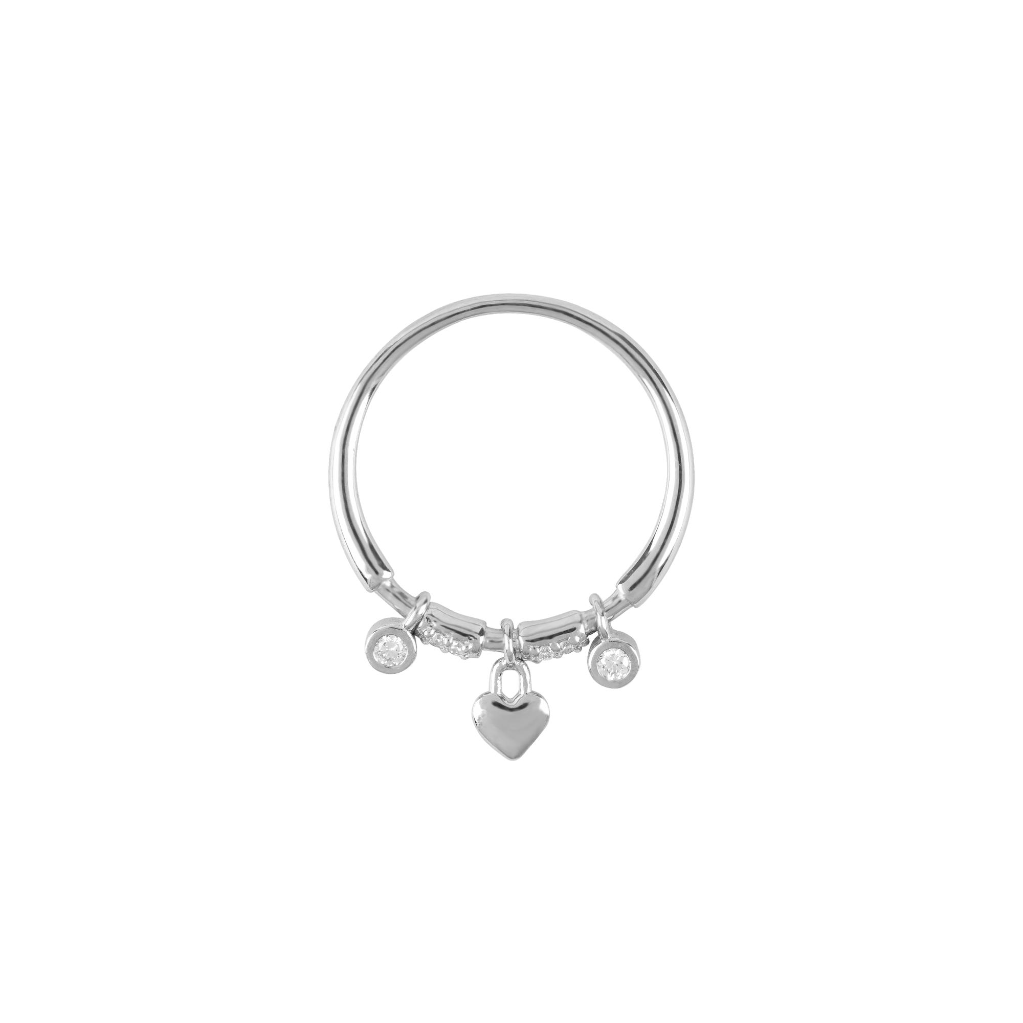 Nhẫn charm trái tim ánh bạc mang phong cách thanh lịch và hiện đại, phù hợp với những ai yêu vẻ đẹp tối giản nhưng giàu cảm xúc. Charm trái tim nhỏ xinh ở trung tâm tượng trưng cho yêu thương và sự gắn kết, được cân đối hài hòa cùng hai viên đá tròn lấp lánh hai bên, tạo điểm nhấn tinh tế cho tổng thể thiết kế.