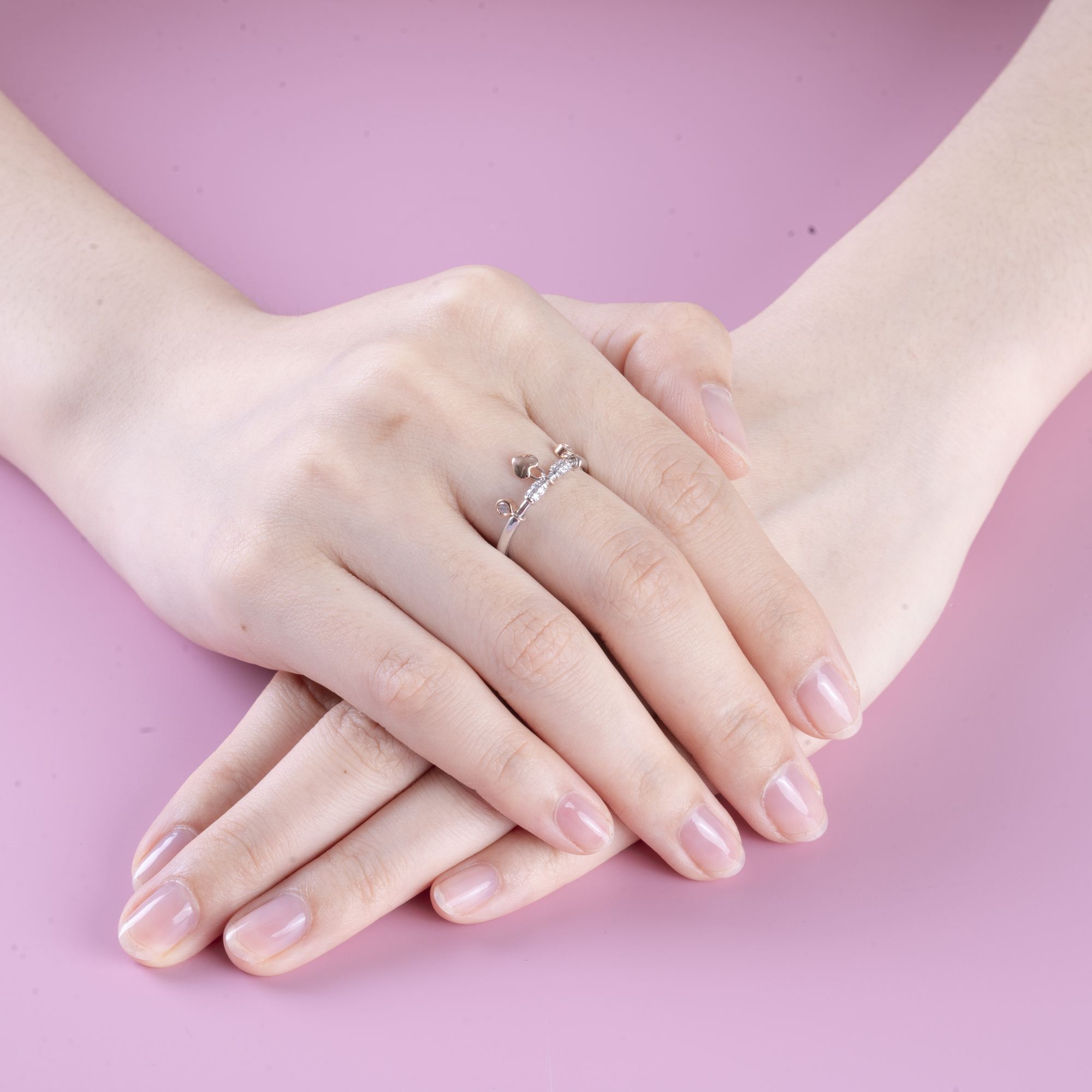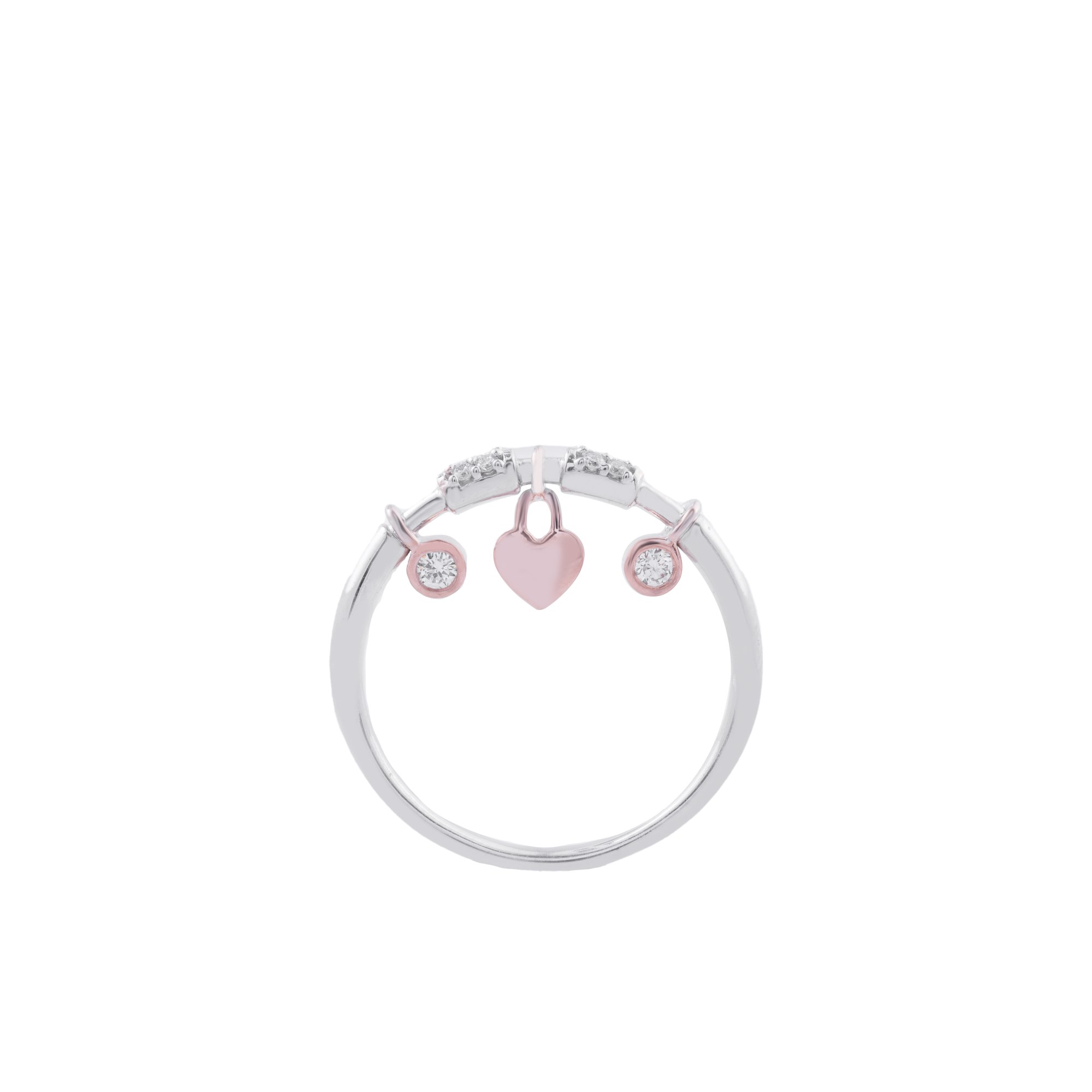Tâm điểm là trái tim vàng hồng mềm mại, tượng trưng cho tình yêu và cảm xúc chân thành. Xen kẽ là các viên kim cương nhỏ được đính tinh tế, mang đến hiệu ứng lấp lánh sống động, tạo nên tổng thể vừa trẻ trung vừa sang trọng.