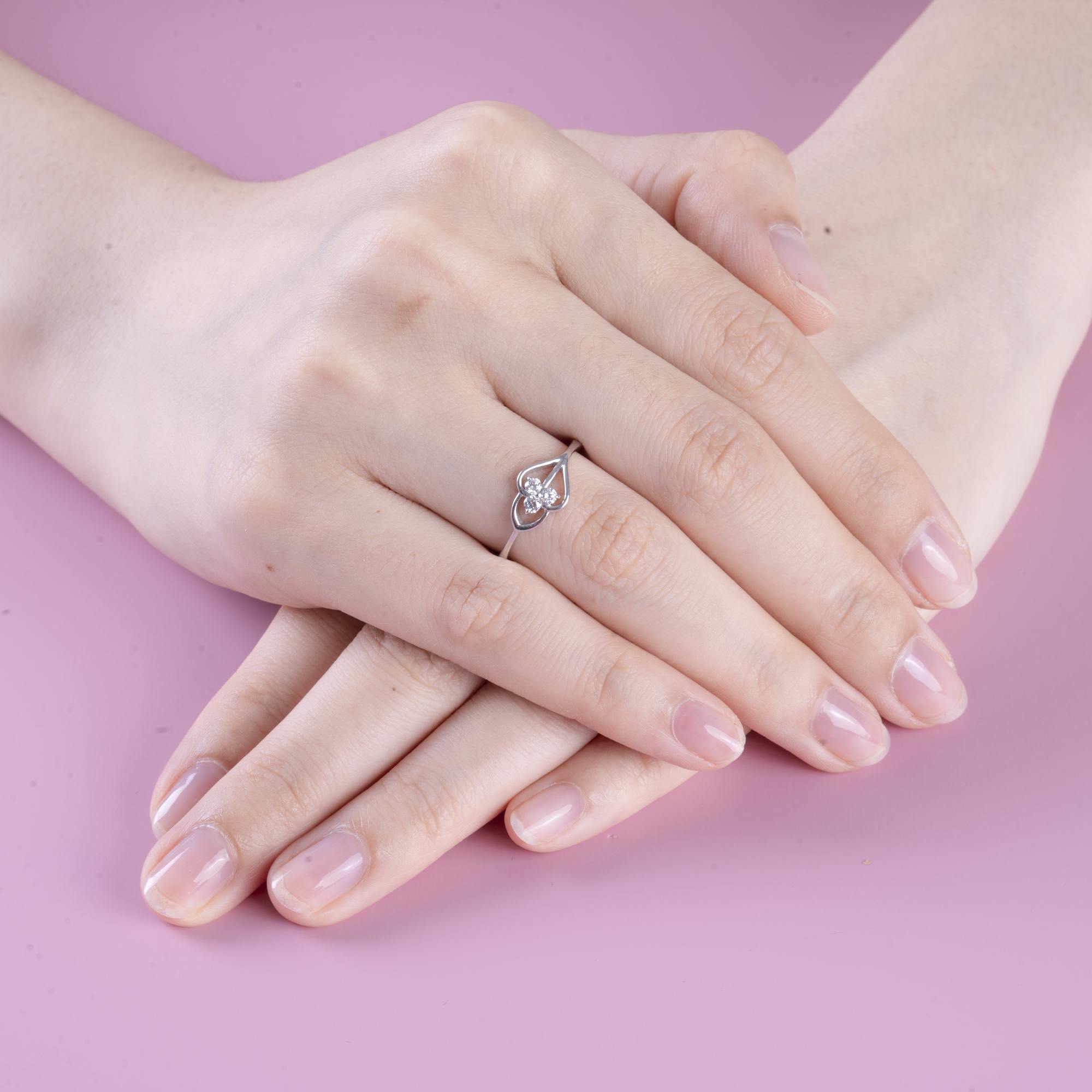 Tâm điểm là cụm kim cương nhỏ được đính khéo léo ở trung tâm, tỏa sáng nhẹ nhàng, như điểm nhấn của cảm xúc chân thành. Tổng thể thiết kế tối giản nhưng đầy ý nghĩa, vừa nữ tính vừa hiện đại.