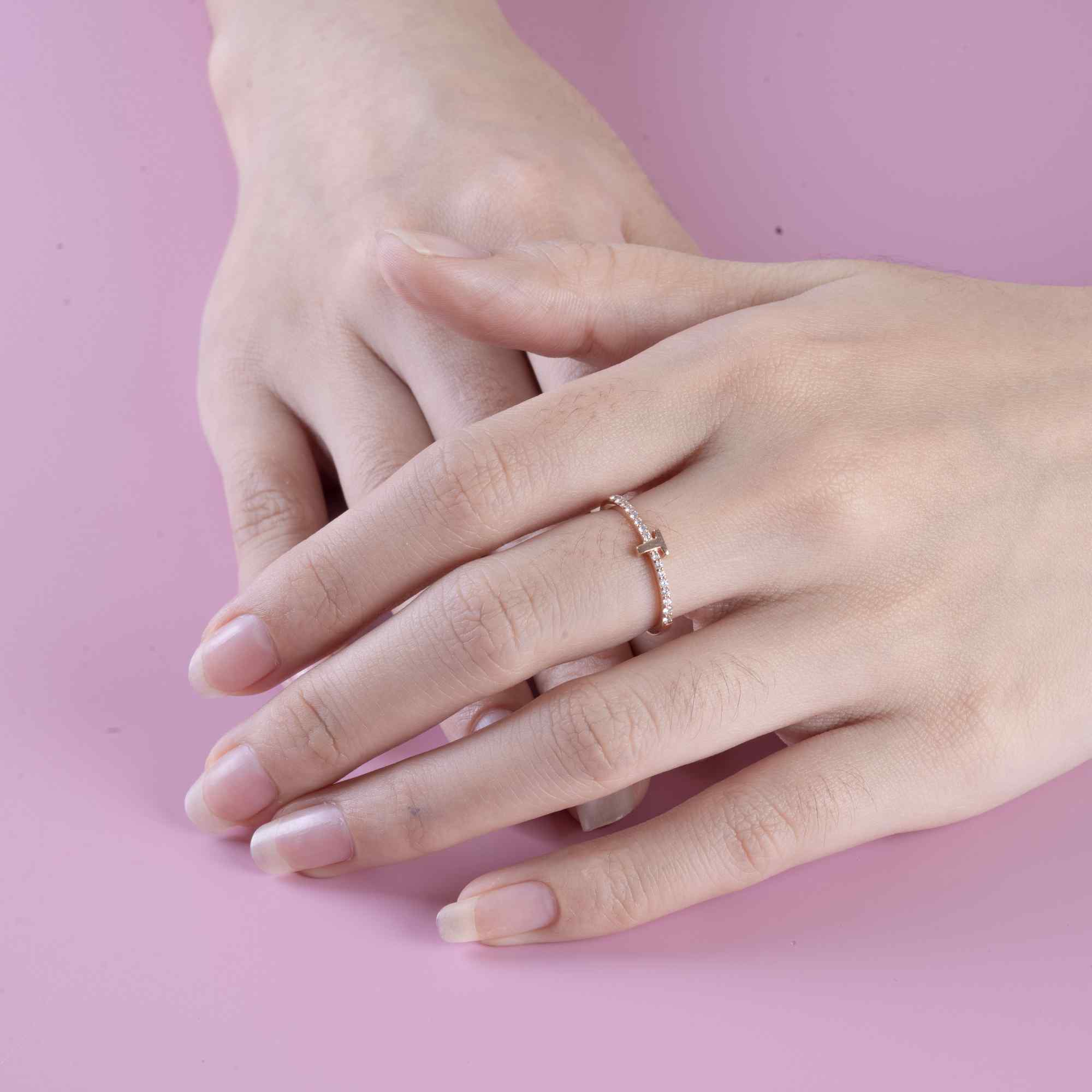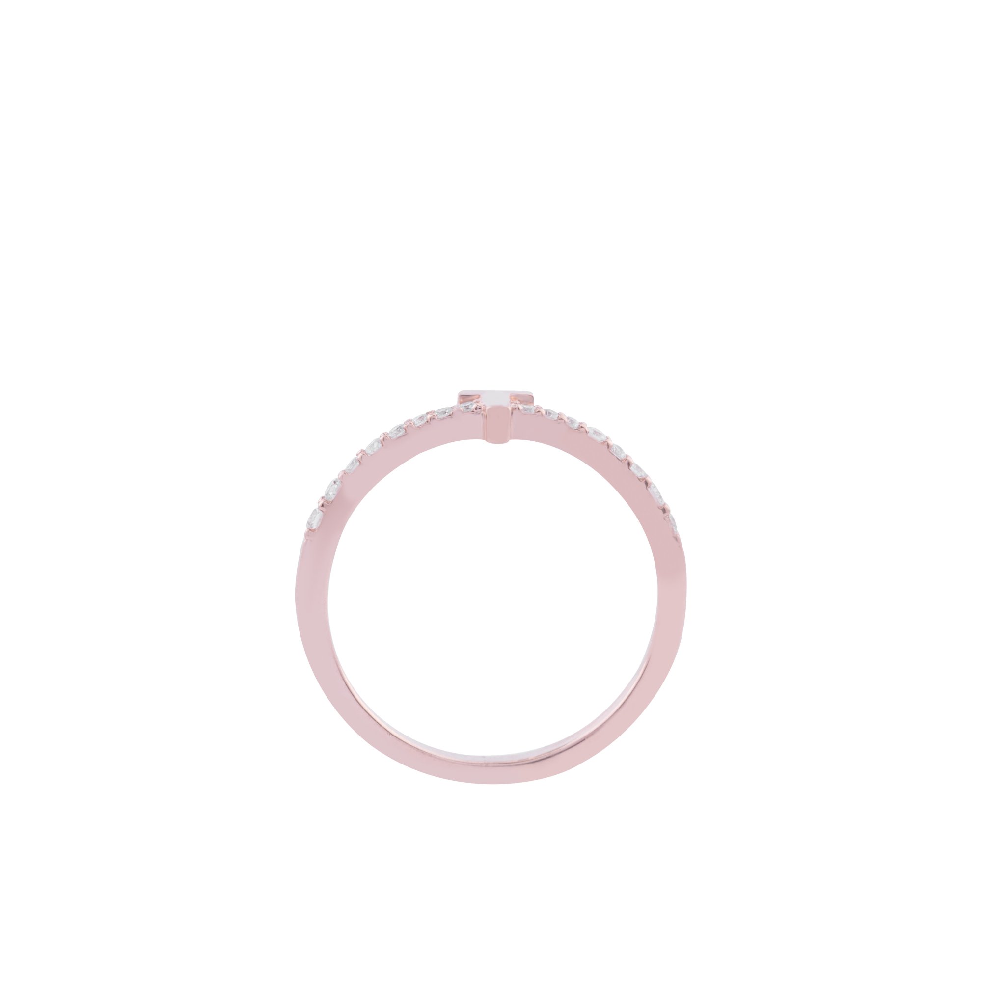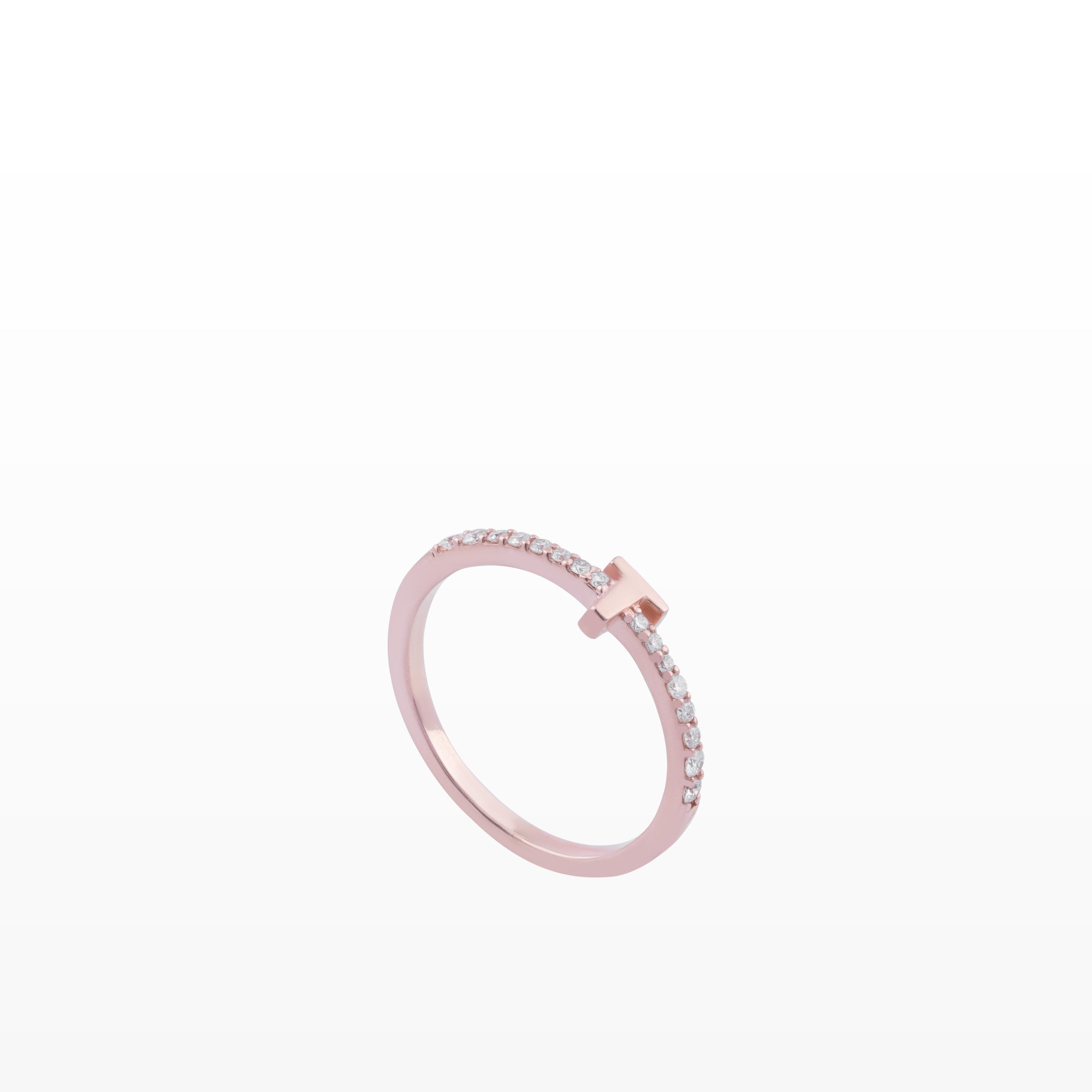 Thiết kế nhẫn nổi bật với chữ T tối giản được đặt cân đối trên nền dải kim cương lấp lánh, tạo nên tổng thể hiện đại, thanh lịch nhưng vẫn đầy cảm xúc. Những viên kim cương được đính đều hai bên thân nhẫn, mang đến hiệu ứng ánh sáng nhẹ nhàng, tinh tế theo từng chuyển động của bàn tay.