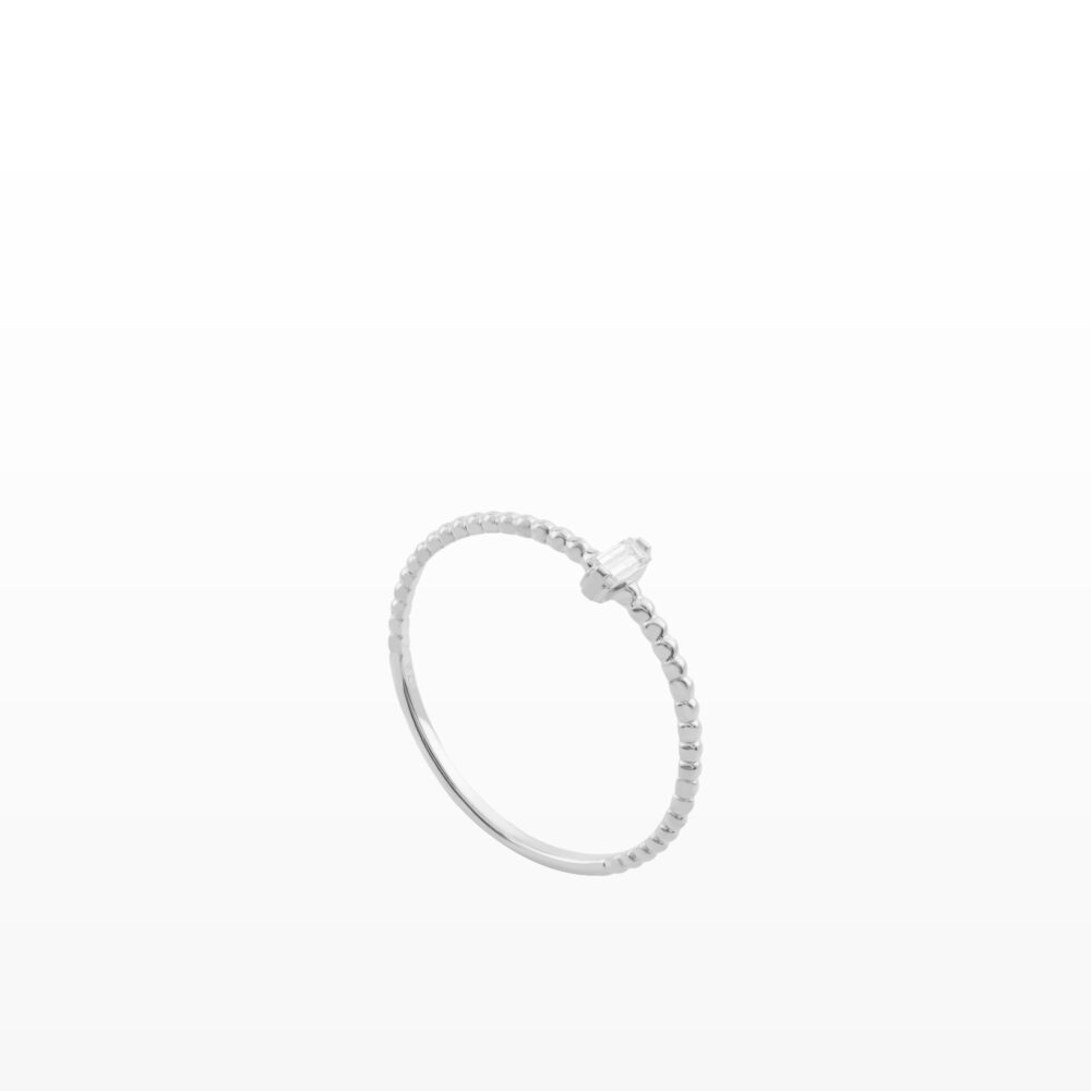 Chiếc nhẫn sở hữu thiết kế thanh mảnh với phần đai nhẫn được tạo hình dạng hạt nhỏ liên tiếp, mang lại cảm giác mềm mại và tinh tế. Ở trung tâm là viên kim cương dáng chữ nhật được đặt nổi bật, tạo điểm nhấn sang trọng và thu hút ánh nhìn.