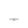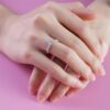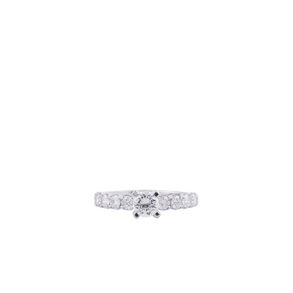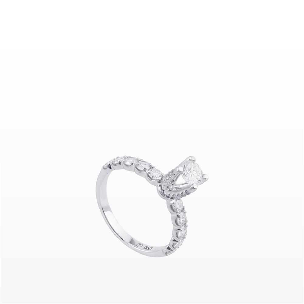 Chiếc nhẫn nổi bật với viên kim cương chủ được nâng cao tinh tế, giúp ánh sáng dễ dàng xuyên qua và phản chiếu rực rỡ từ mọi góc độ. Phần đai nhẫn đính kim cương tấm liên tiếp tạo hiệu ứng lấp lánh mềm mại, như một dòng ánh sáng ôm trọn lấy ngón tay.