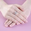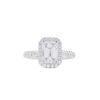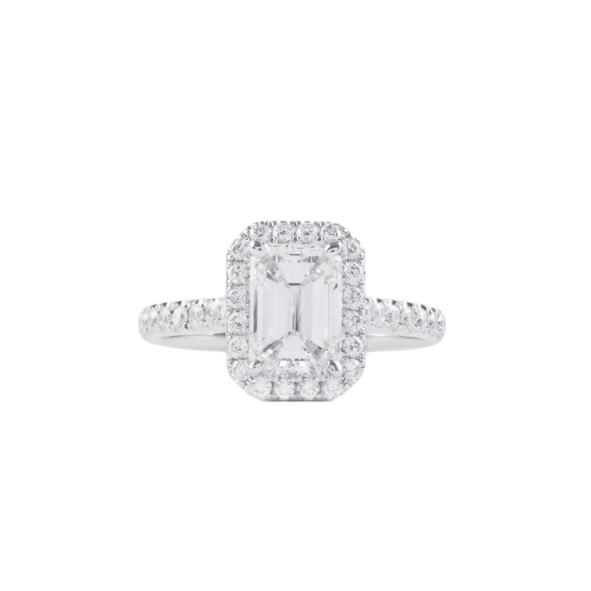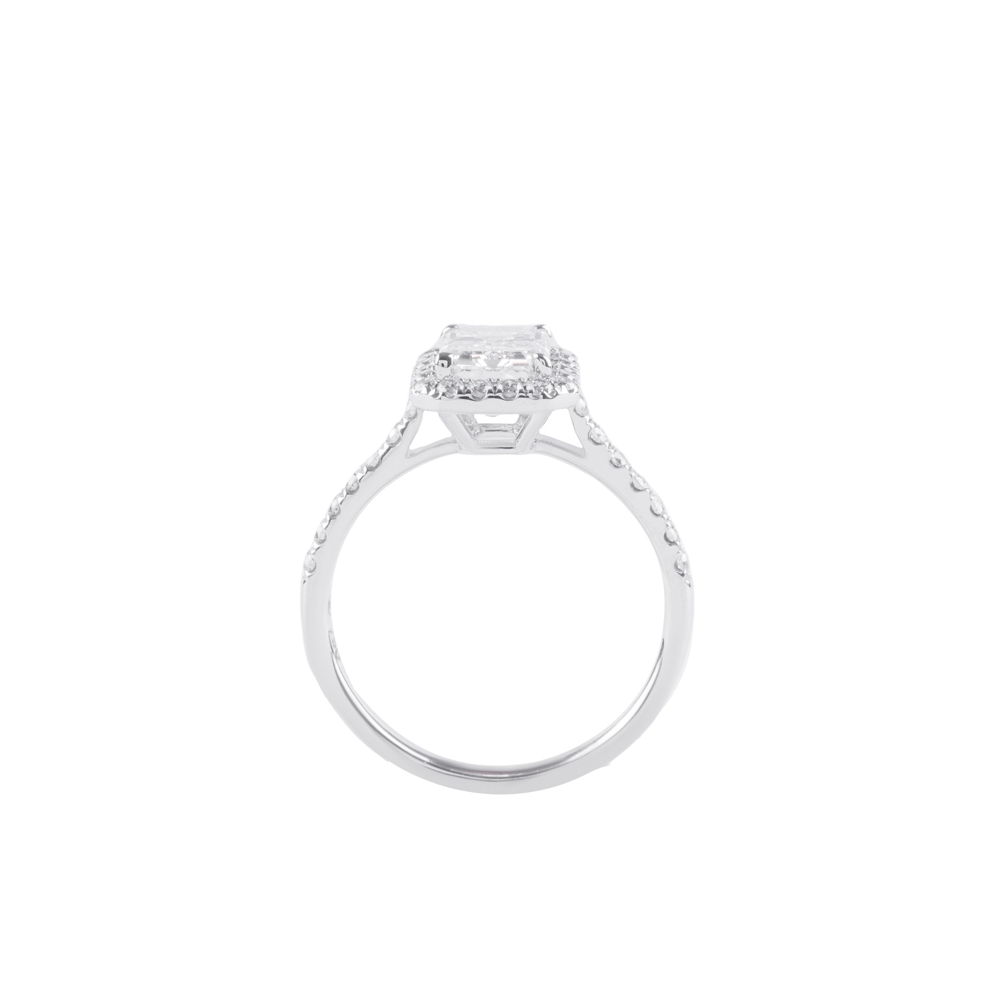 Chiếc nhẫn nổi bật với viên kim cương chủ dáng emerald – biểu tượng của sự thanh lịch và đẳng cấp vượt thời gian. Các mặt cắt bậc (step-cut) tạo nên hiệu ứng phản chiếu sâu, mang lại vẻ đẹp trầm lắng, sang trọng và đầy cuốn hút.