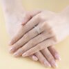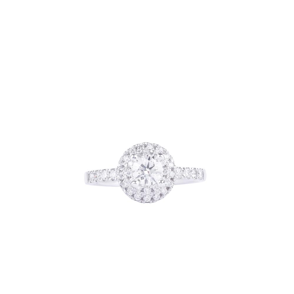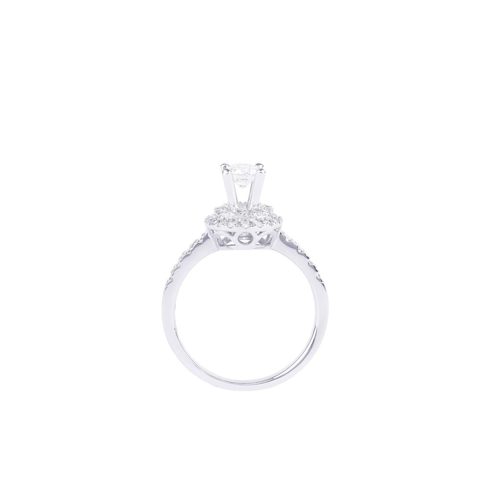 Viên đá chủ sáng lấp lánh ở trung tâm, được bao quanh bởi quầng halo nhỏ nhắn, tôn lên vẻ kiêu sa và tinh tế trong từng chi tiết.