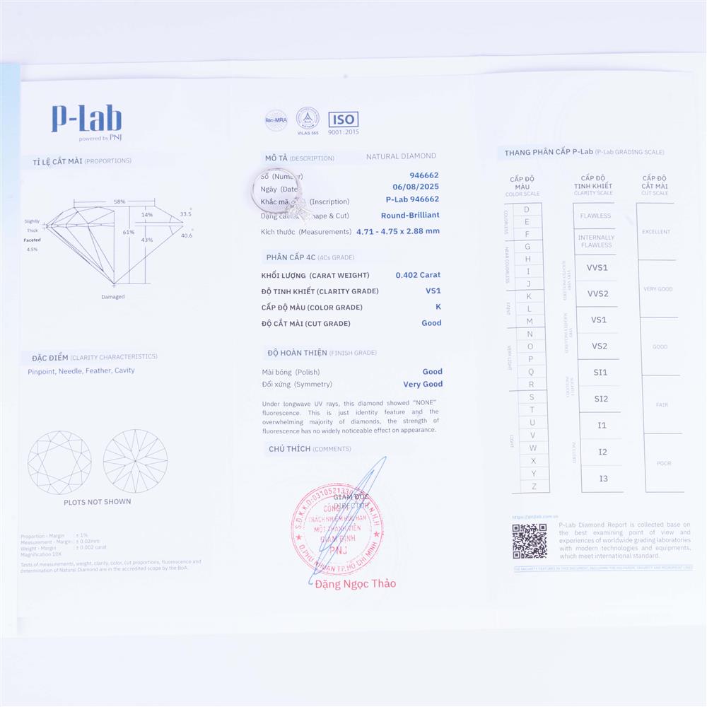 | Kim cương viên: | 4.71 - 4.75 LY K/VS1 |