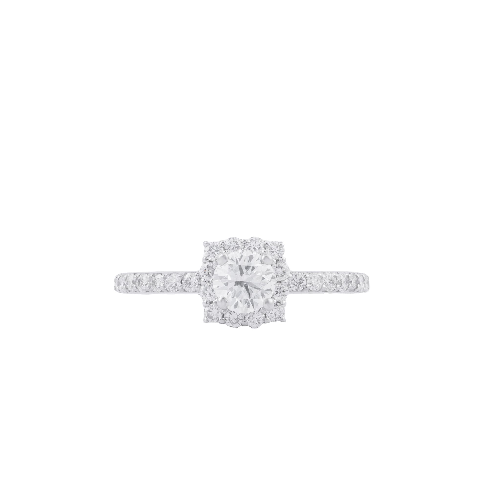 Nhẫn kim cương halo tỏa sáng với vẻ đẹp sang trọng và tinh tế, nổi bật bởi viên kim cương trung tâm được bao bọc bởi vòng kim cương tấm lấp lánh. Thiết kế halo không chỉ giúp viên đá chủ trông lớn và rực rỡ hơn, mà còn tạo hiệu ứng ánh sáng đa chiều, thu hút mọi ánh nhìn ở từng cử động nhỏ nhất.