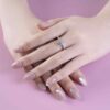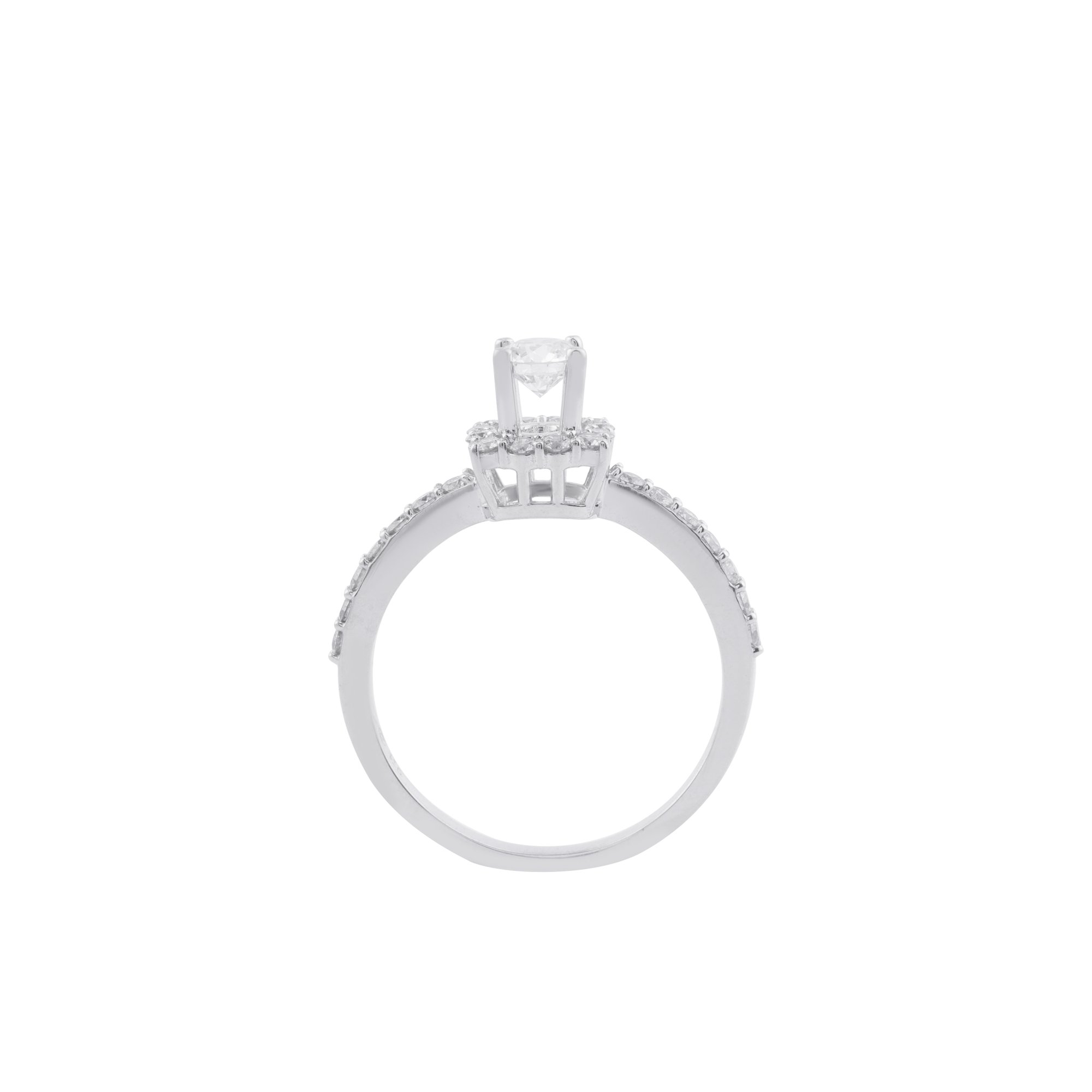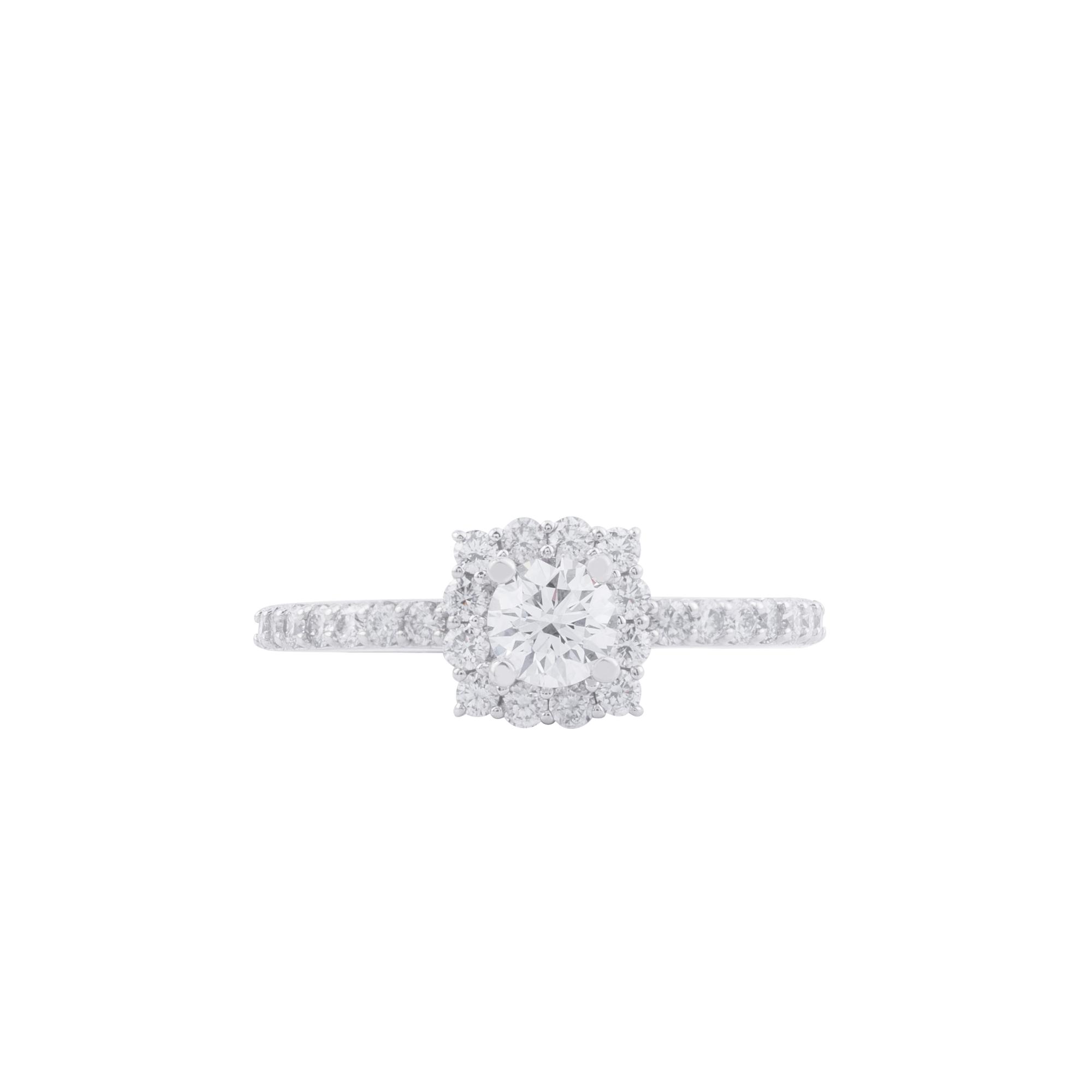 Viên chủ trung tâm rực rỡ được bao quanh bởi vòng tấm lấp lánh như vầng hào quang của khoảnh khắc yêu thương trọn vẹn. Dải kim cương tấm chạy đều trên thân nhẫn tượng trưng cho sự đồng hành bền bỉ, nơi mỗi bước đi đều có nhau sát cánh.