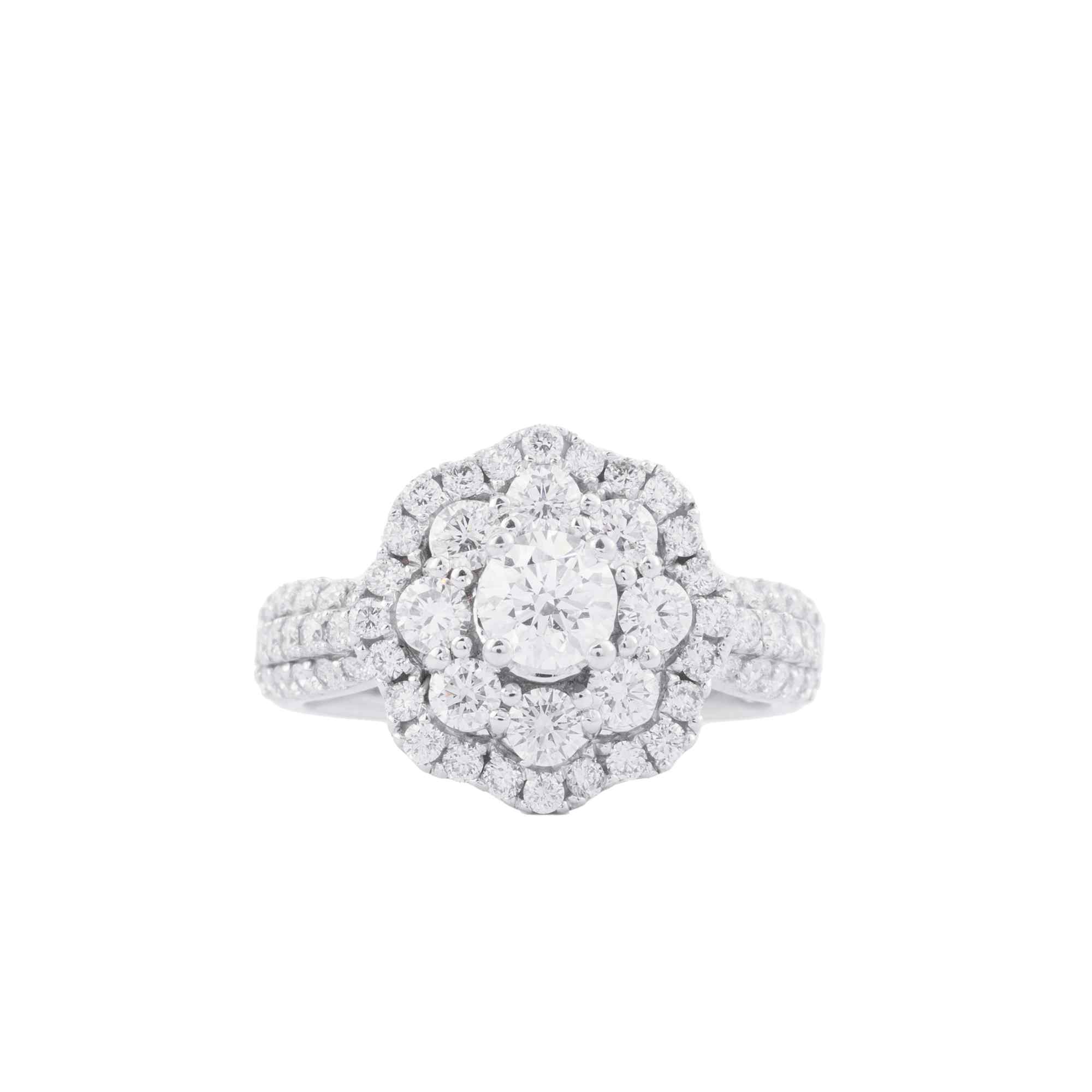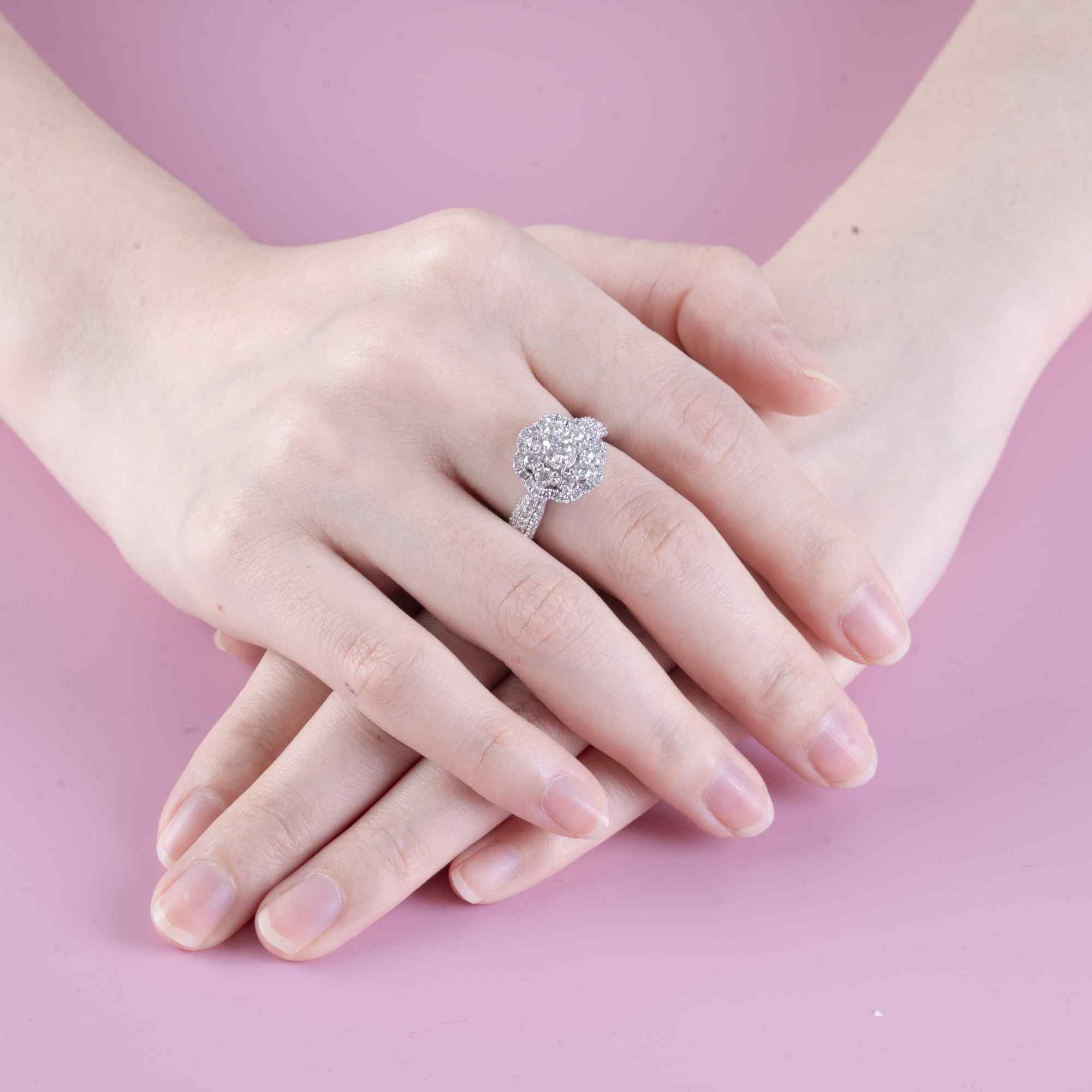 Thiết kế tựa như một đóa hoa kim cương đang bung nở rực rỡ trên nền vàng trắng tinh khôi. Viên kim cương trung tâm tỏa sáng nổi bật, được bao quanh bởi nhiều tầng kim cương tấm sắp xếp tinh xảo, tạo hiệu ứng halo đa lớp đầy cuốn hút.