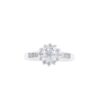 Bao quanh là những viên kim cương tấm được sắp đặt khéo léo, tạo nên hiệu ứng ánh sáng đa chiều, khiến toàn bộ chiếc nhẫn trở thành biểu tượng của sự xa hoa và sang trọng tuyệt đối. Thân nhẫn đính kim cương đều đặn, tinh tế, càng làm nổi bật vẻ quyền quý của thiết kế.