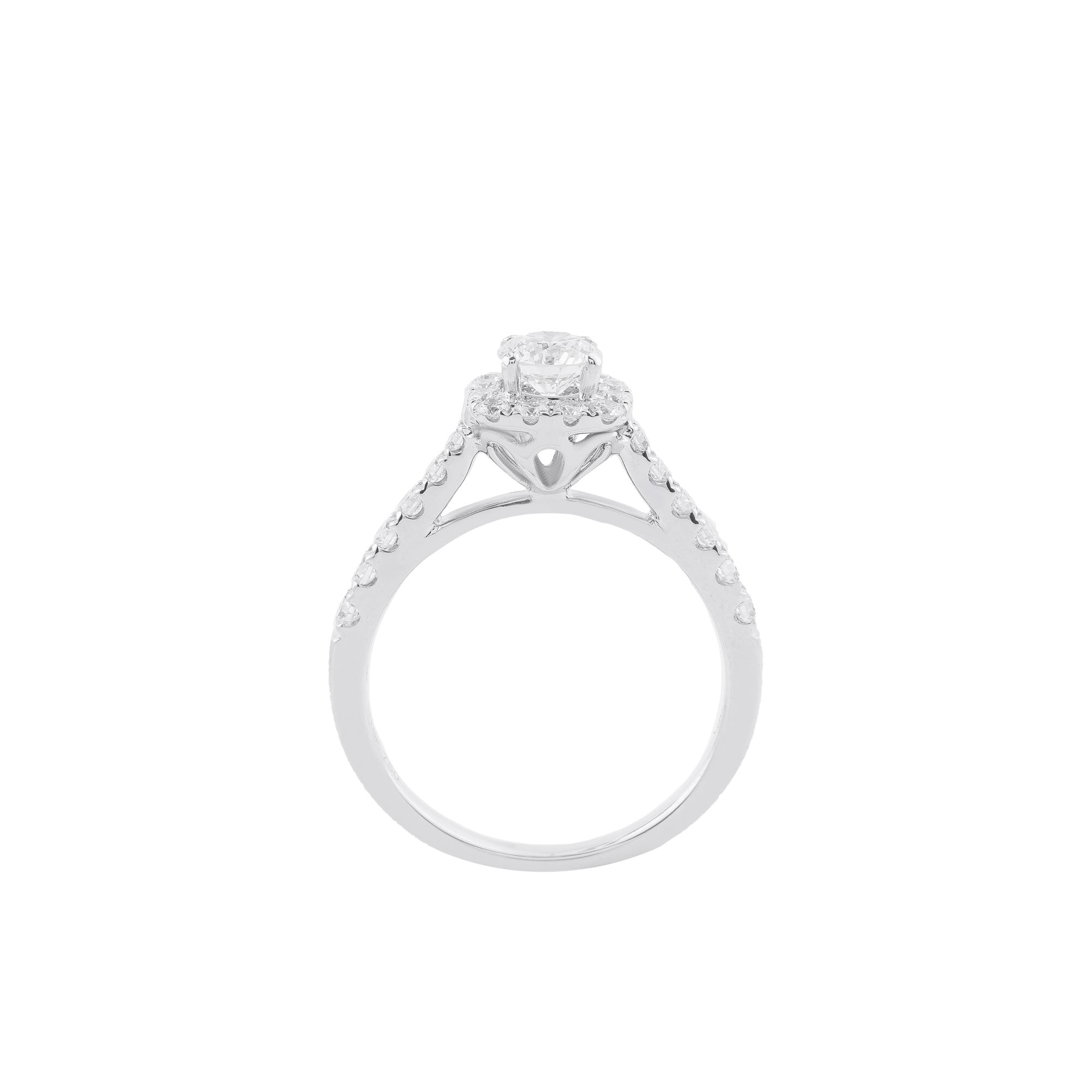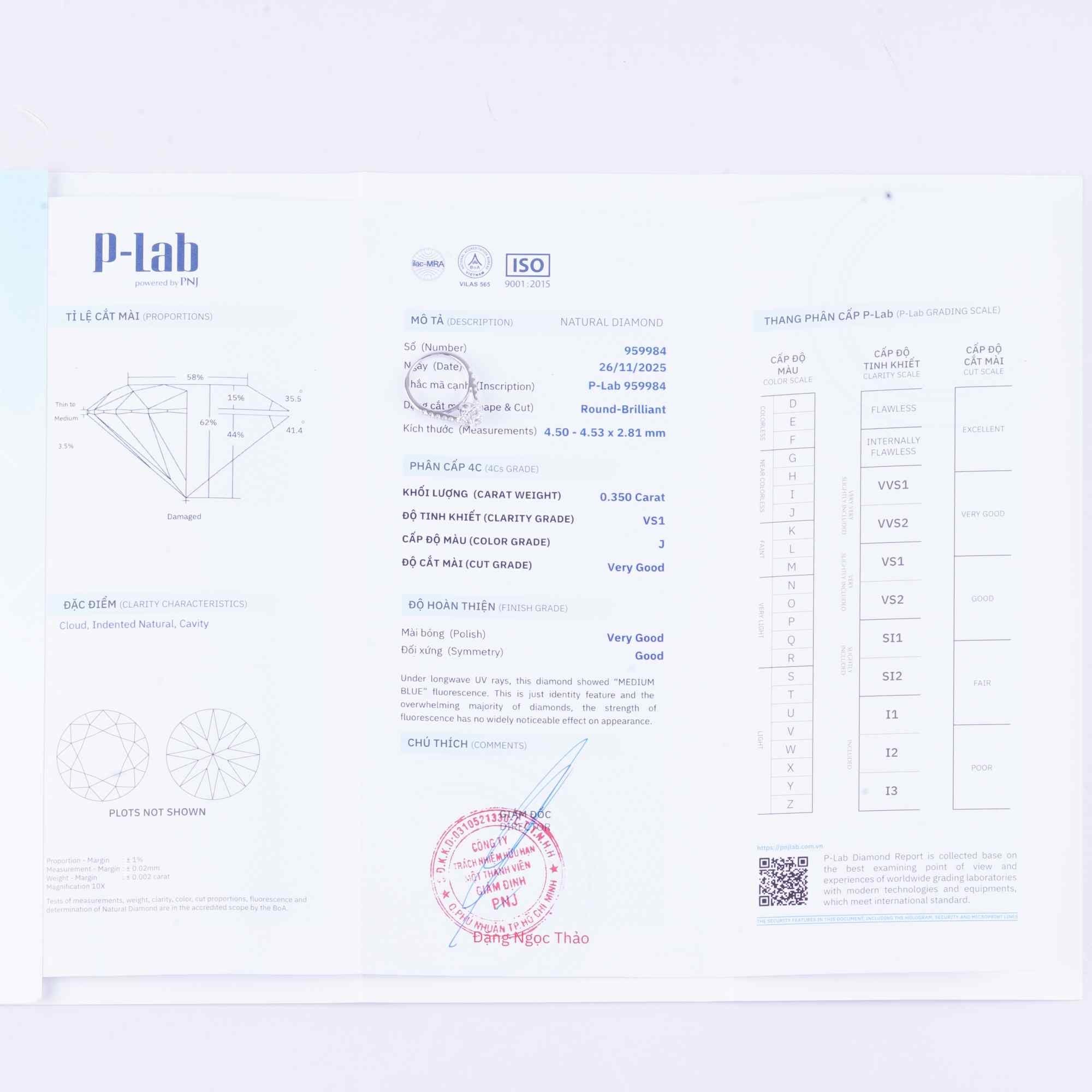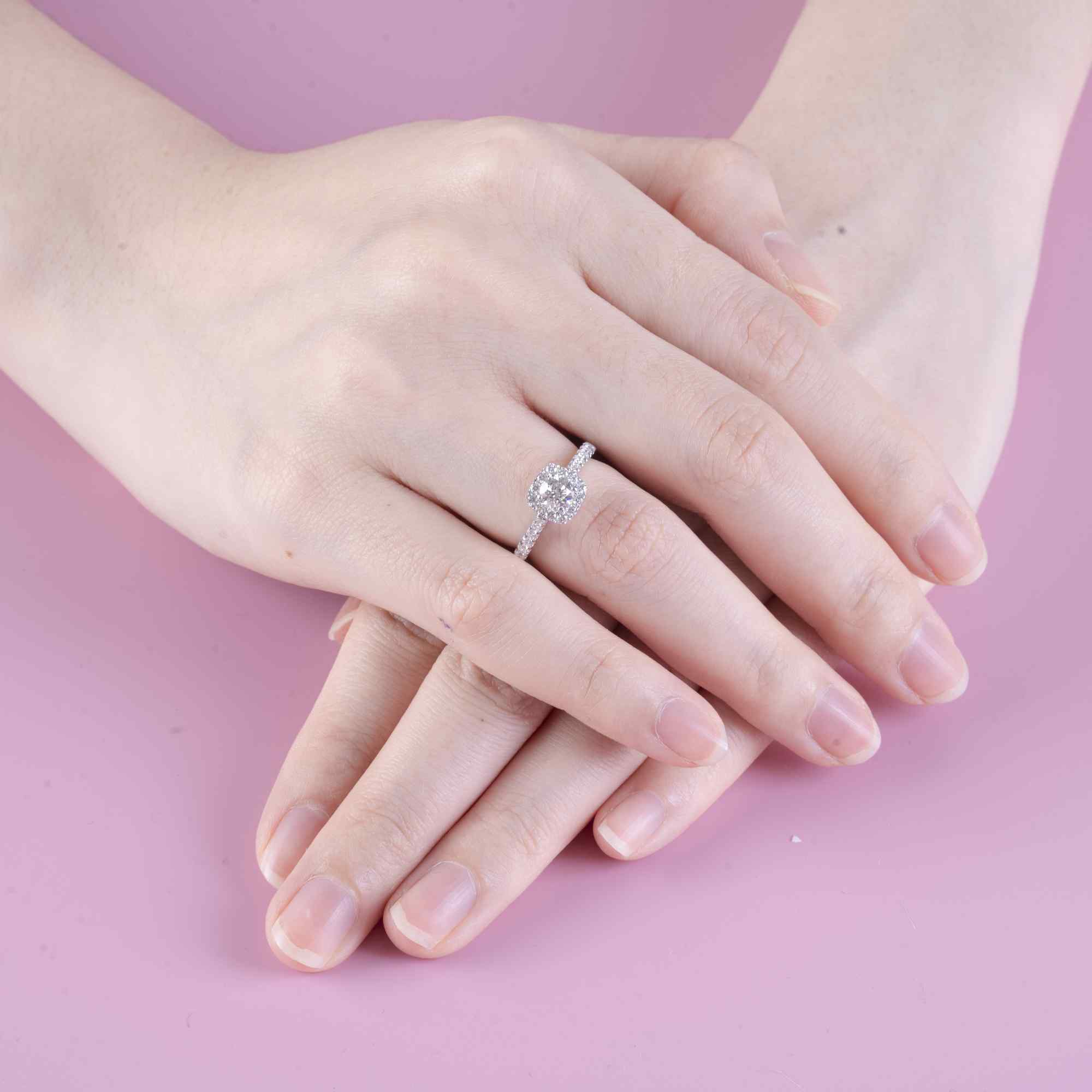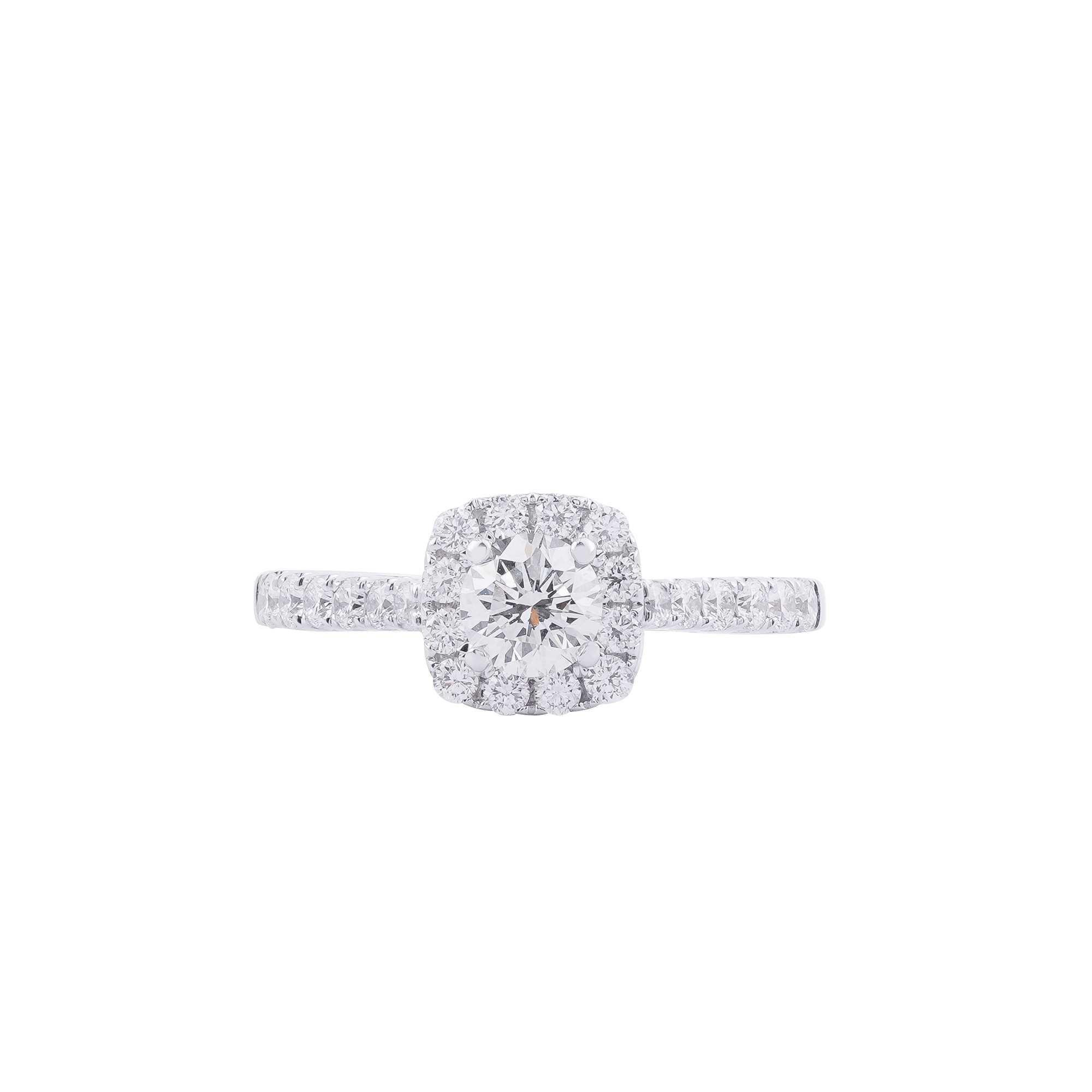 Thiết kế nổi bật với viên kim cương tròn trung tâm được bao bọc bởi khung halo dáng cushion mềm mại, tạo hiệu ứng đầy đặn và tăng cường độ lấp lánh tối đa. Sự kết hợp giữa đường viền bo tròn thanh lịch và ánh sáng đa chiều mang đến vẻ đẹp vừa cổ điển vừa hiện đại.