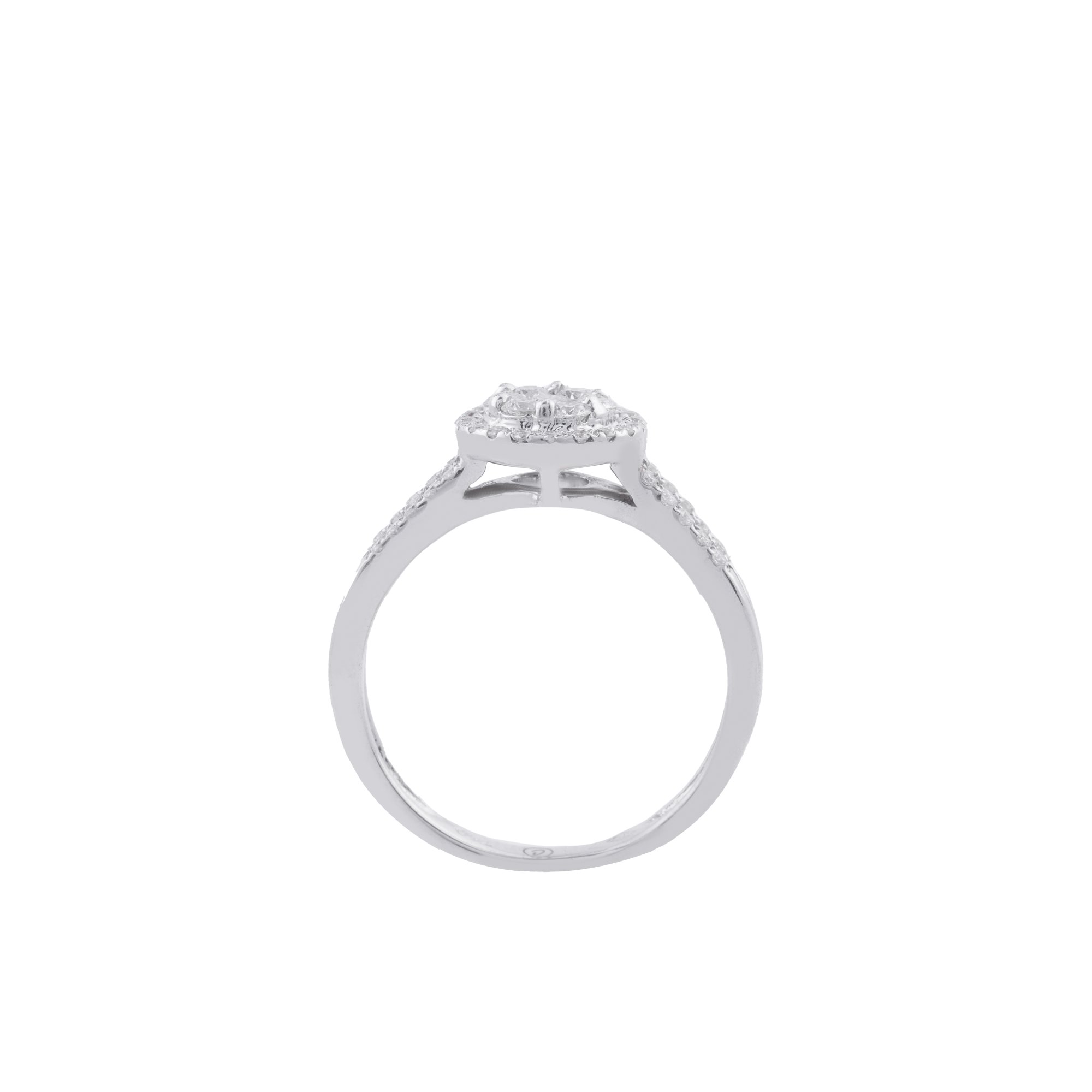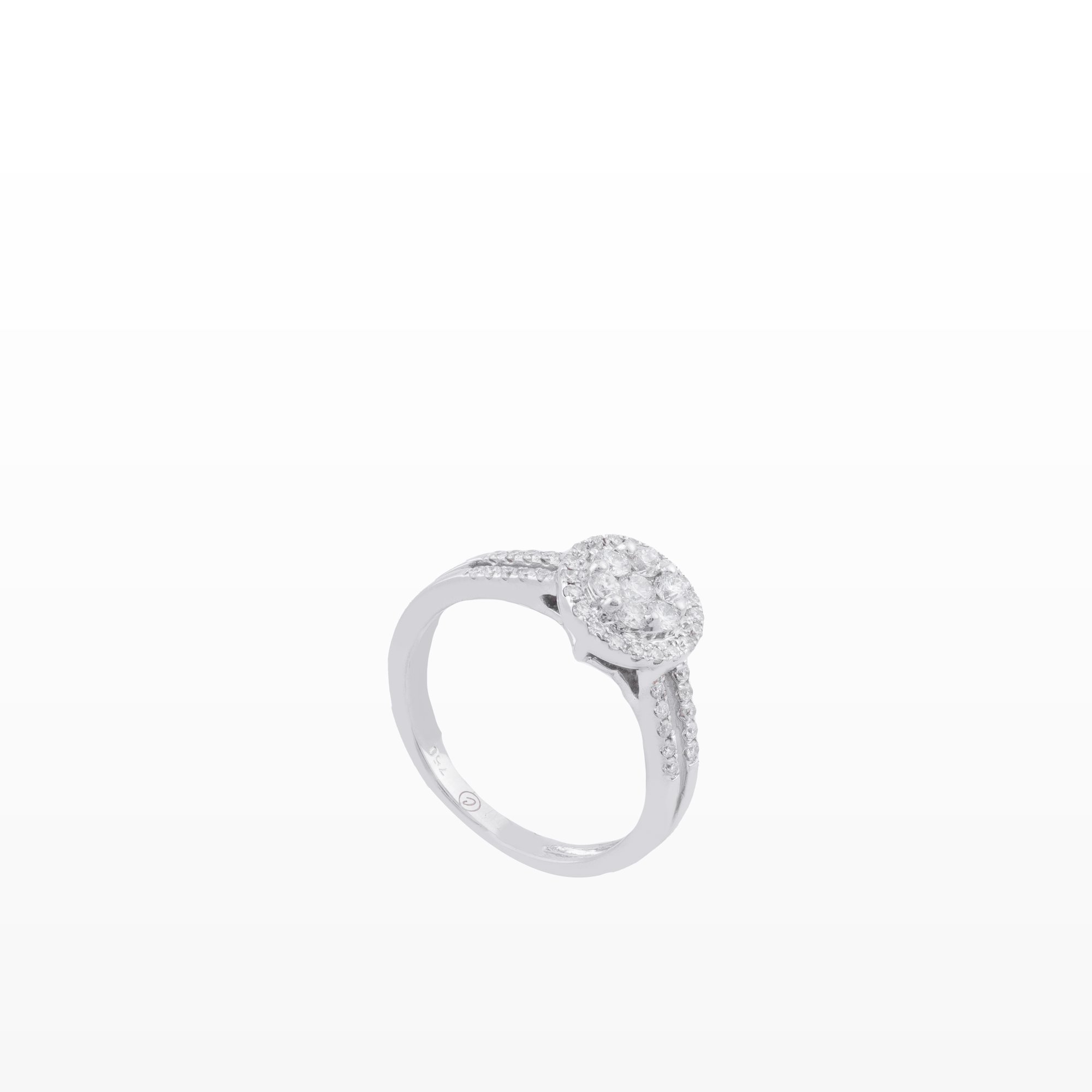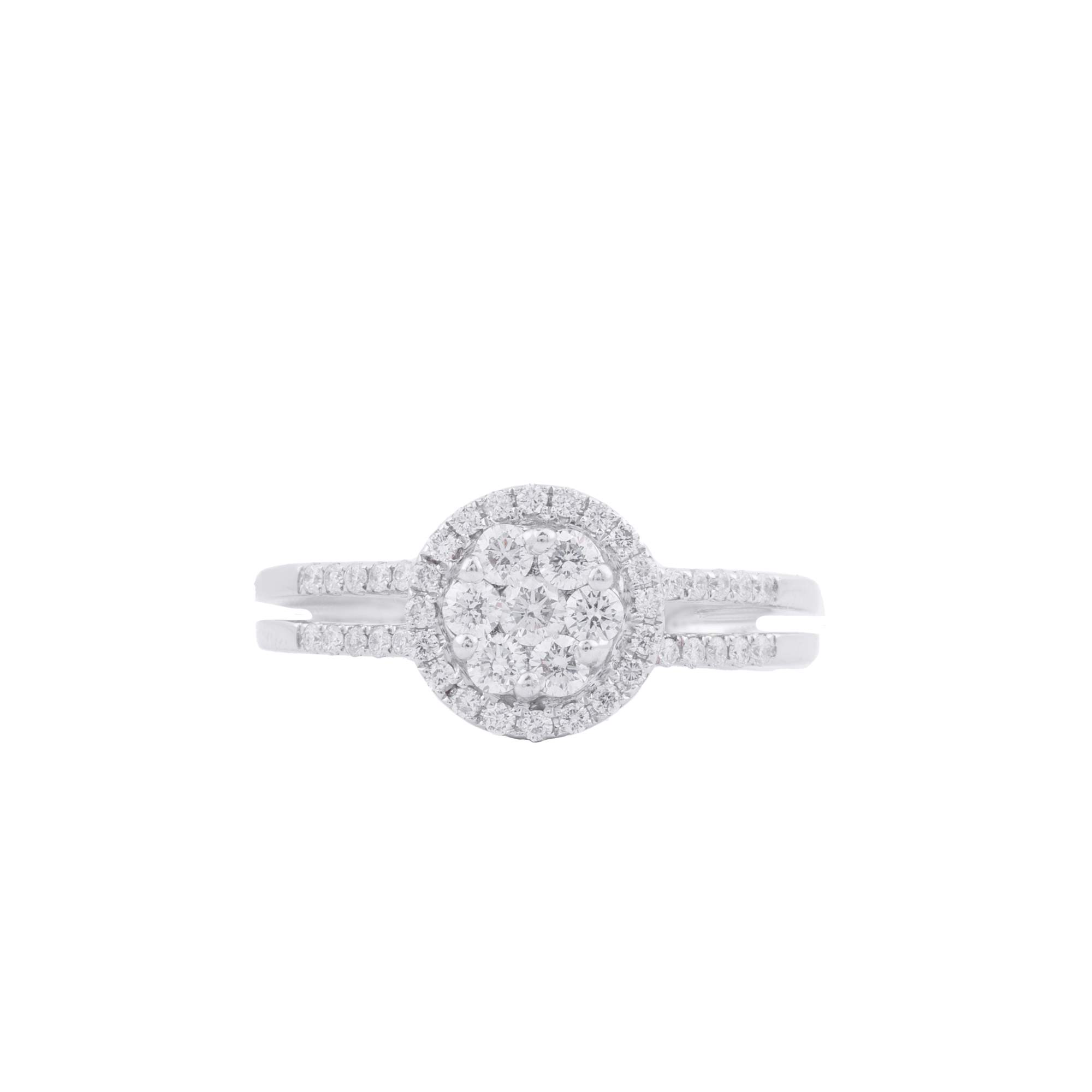 Chiếc nhẫn nổi bật với cụm kim cương tròn trung tâm, được kết từ nhiều viên kim cương nhỏ tạo hiệu ứng viên chủ lớn, tăng tối đa độ lấp lánh. Bao quanh là vòng halo kim cương tròn tinh xảo, giúp tổng thể trở nên rực rỡ và sang trọng hơn dưới mọi góc nhìn.