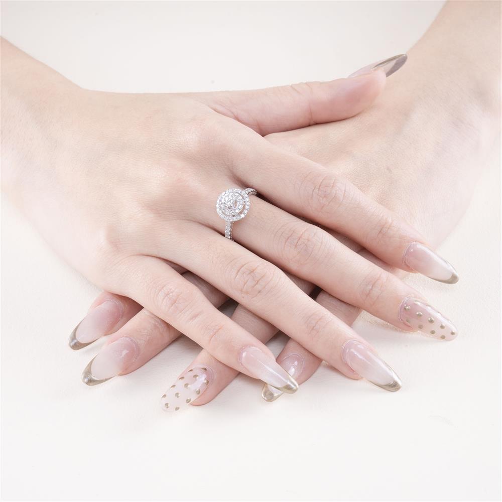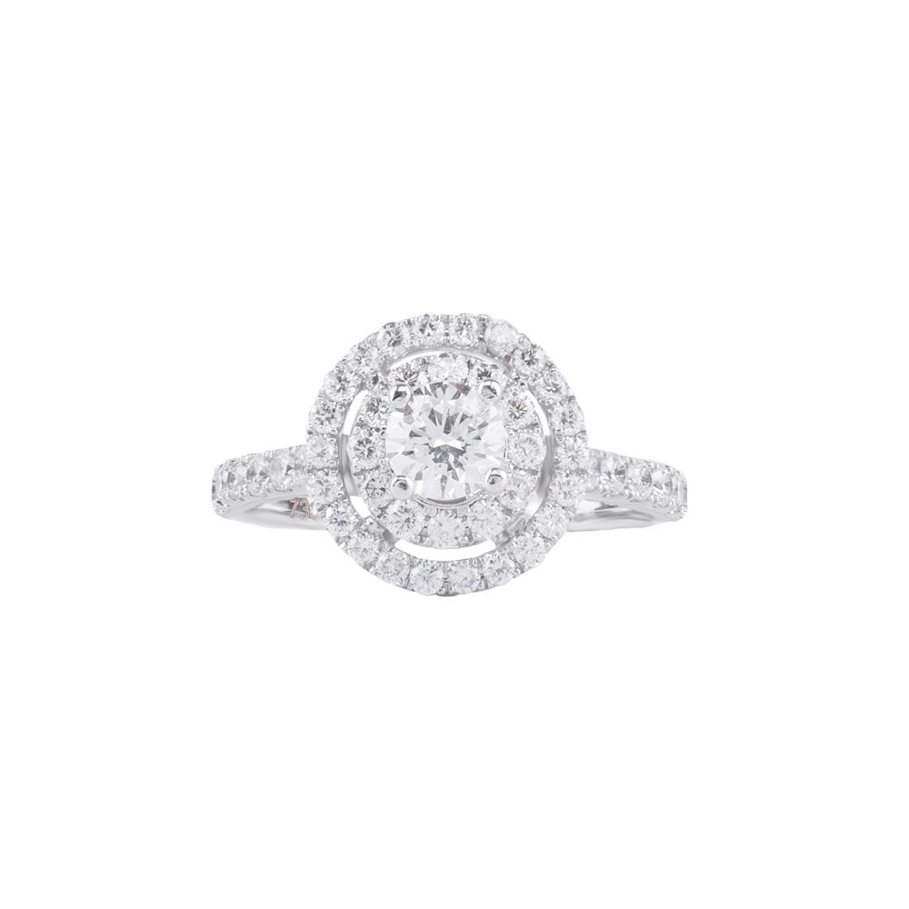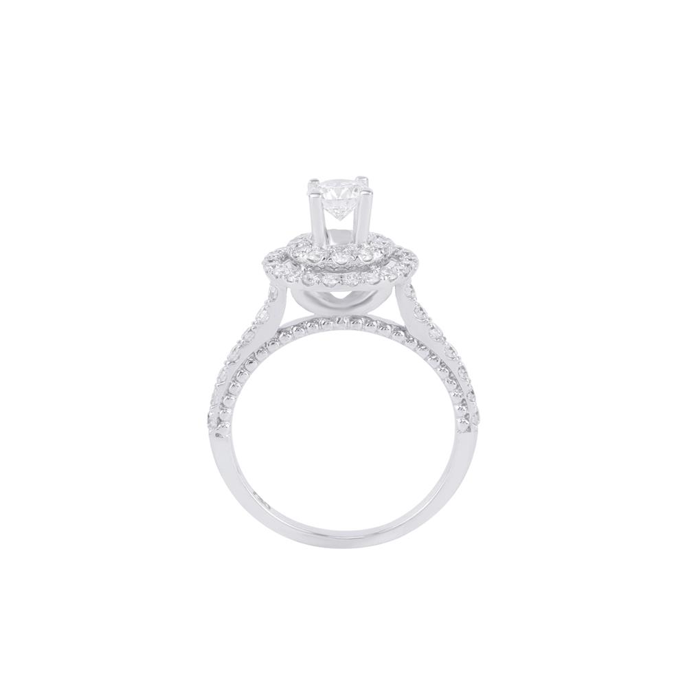 Tâm điểm là viên kim cương chủ sáng lấp lánh, được bao quanh bởi hai vòng kim cương nhỏ xếp tầng – tạo nên hiệu ứng ánh sáng đa chiều rực rỡ và sang trọng bậc nhất.