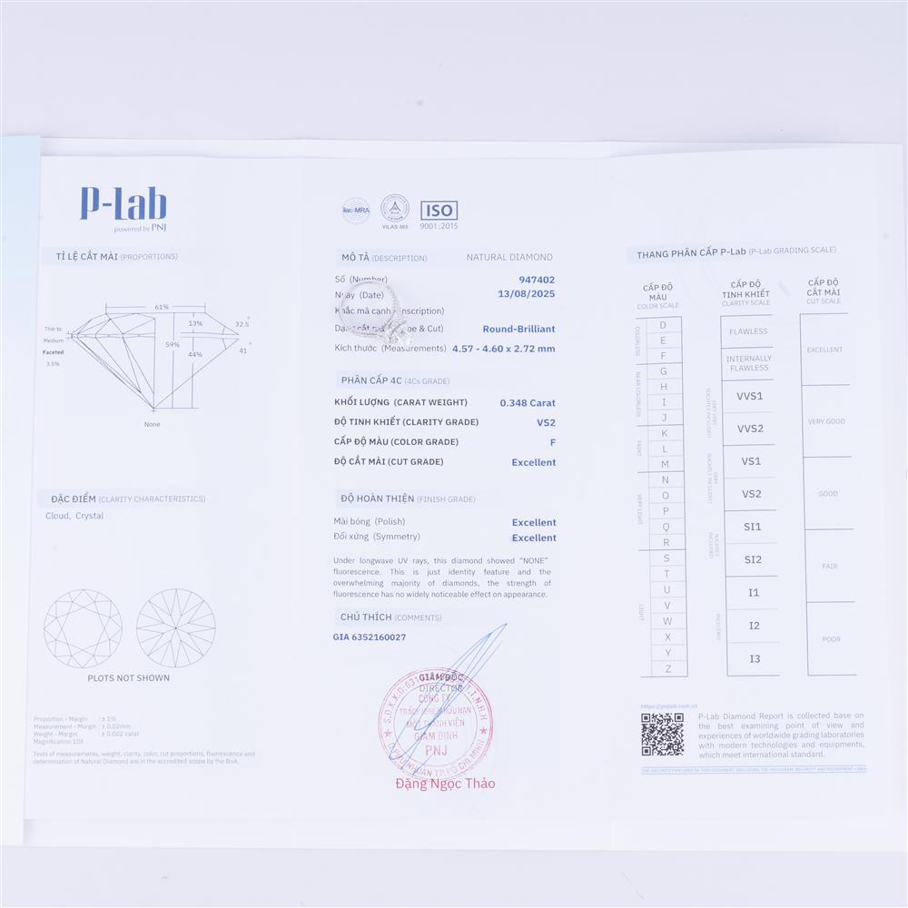 | Kim cương viên: | 4.57 - 4.60 LY F/VS2 |