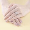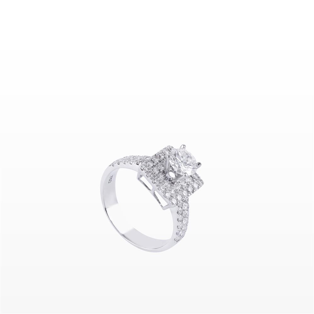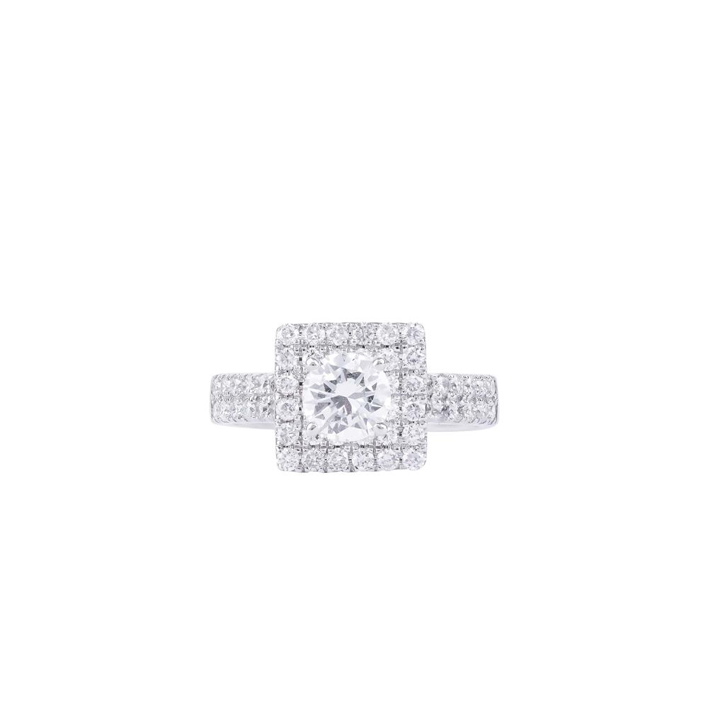 Tâm điểm là viên kim cương tròn rực rỡ, được bao quanh bởi khung viền vuông hai tầng tinh xảo biểu trưng cho sự cân bằng hoàn hảo giữa mạnh mẽ và dịu dàng. Từng viên đá nhỏ được tỉ mỉ gắn kết, tạo nên hiệu ứng ánh sáng lan tỏa tựa như quầng hào quang vĩnh cửu.