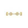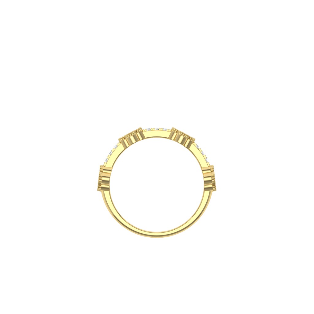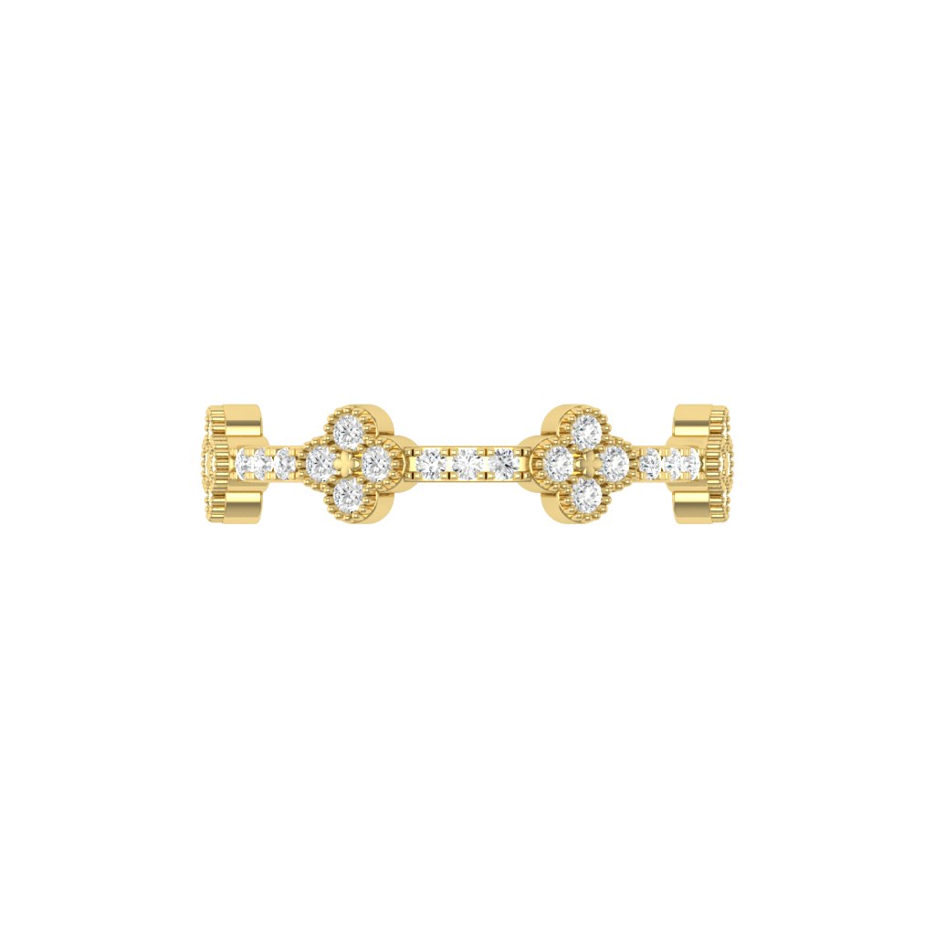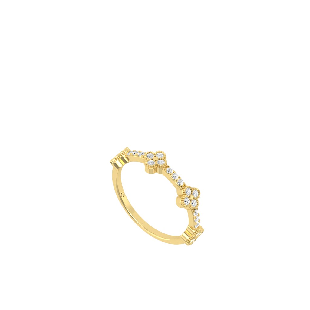 Mỗi bông hoa được tạo nên từ nhiều viên kim cương nhỏ, xếp khít nhau tạo hiệu ứng micro-pavé lấp lánh, vừa mềm mại vừa giàu chi tiết. Phần thân nhẫn mảnh nhưng được xử lý texture nhẹ ở hai đầu, giúp tổng thể có chiều sâu và không bị đơn điệu.