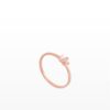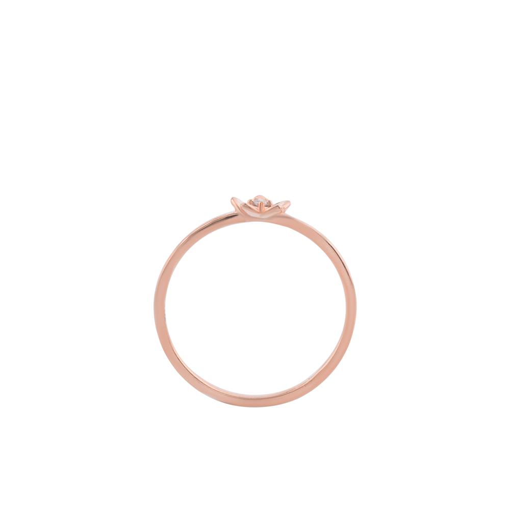 Chiếc nhẫn mang thiết kế hoa 5 cánh cách điệu, với bề mặt bo tròn mềm mại, phản chiếu ánh sáng dịu nhẹ. Ở trung tâm là một viên kim cương nhỏ đính tinh tế, tạo điểm nhấn lấp lánh vừa đủ, tôn lên vẻ thanh nhã của tổng thể.