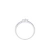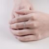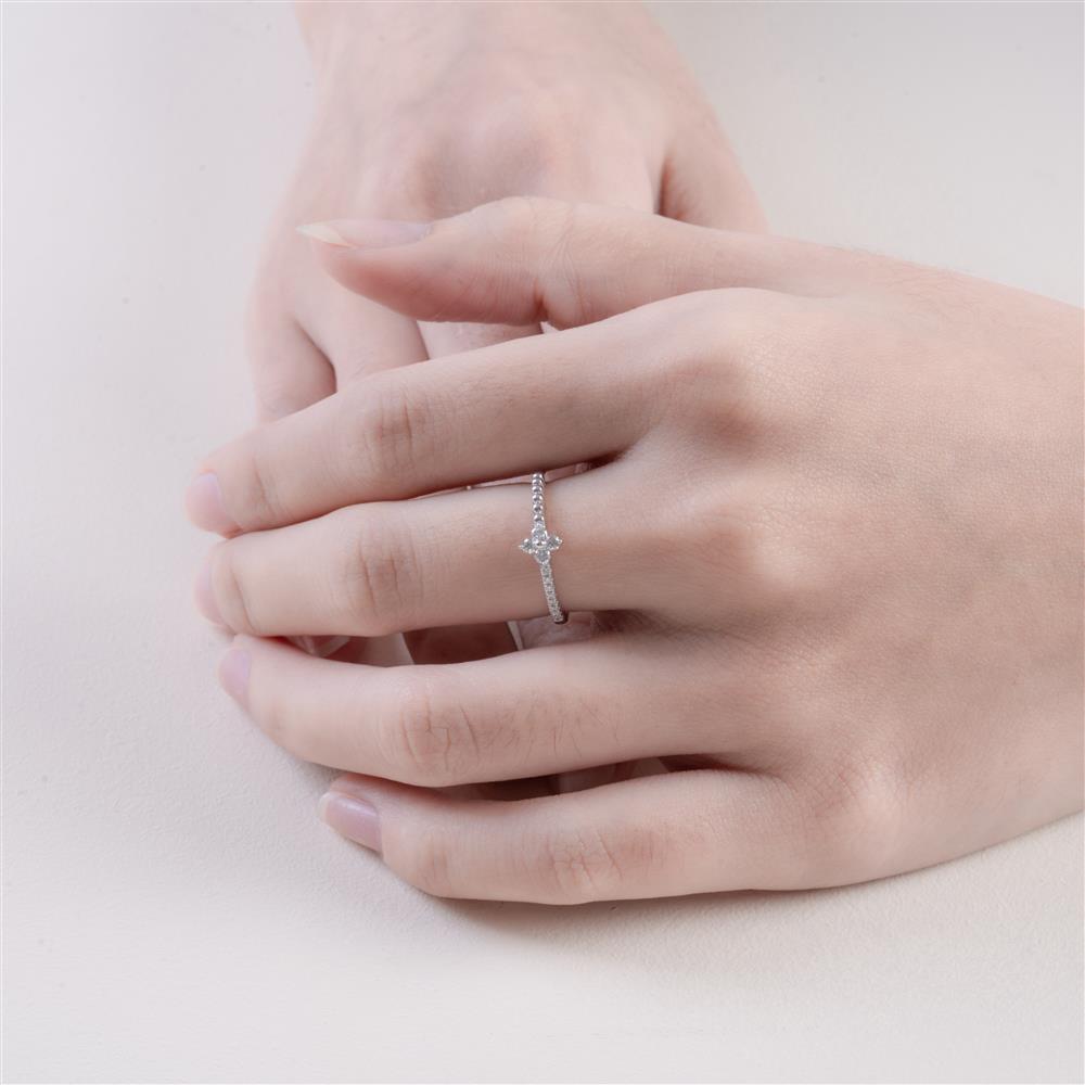 Phần đai nhẫn thanh mảnh, một bên trơn bo cong mượt mà, một bên đính kim cương tấm tinh tế, tạo sự cân đối hài hòa và hiệu ứng ánh sáng dịu dàng. Tổng thể thiết kế mang phong cách nhẹ nhàng, hiện đại, dễ đeo hằng ngày và phù hợp với nhiều phong cách khác nhau.