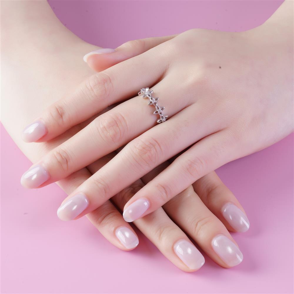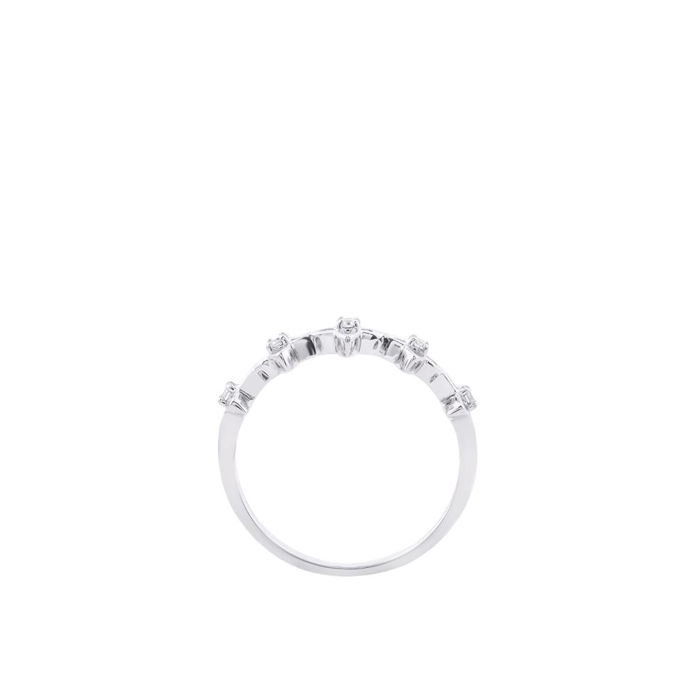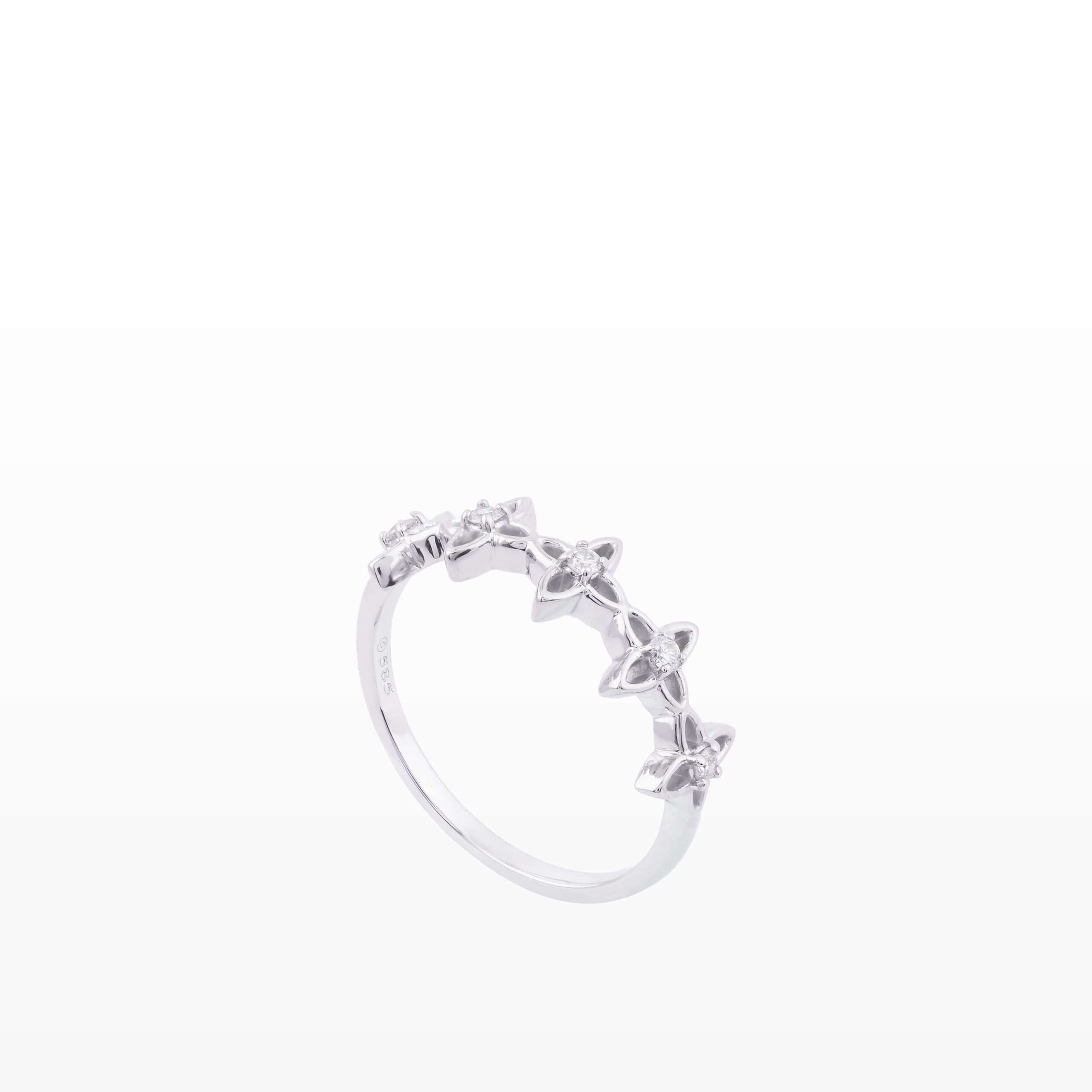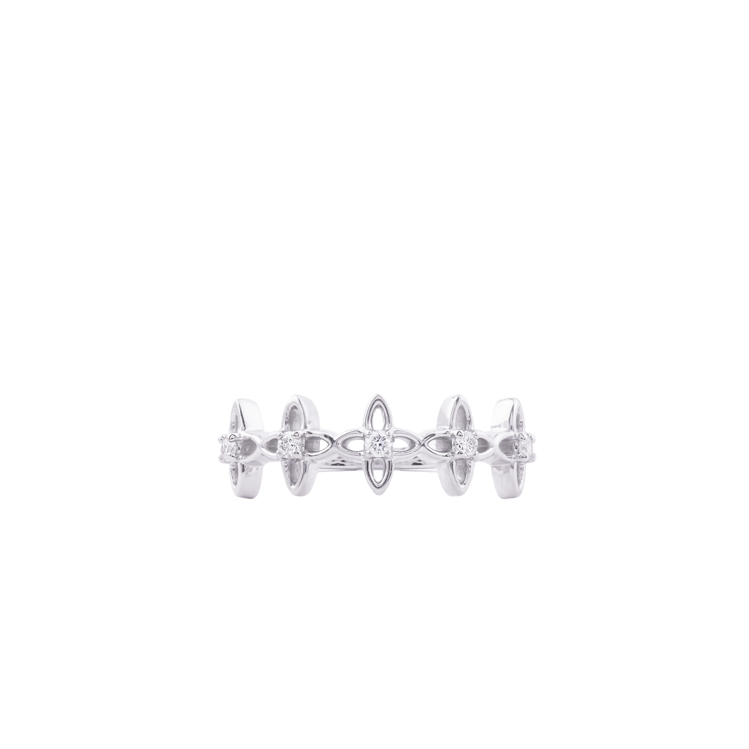 Nhẫn kim cương gây ấn tượng với thiết kế họa tiết đối xứng lặp lại, lấy cảm hứng từ hình học mềm mại và sự cân bằng hoàn hảo. Các mô-típ oval được sắp xếp liên hoàn quanh thân nhẫn, mỗi điểm giao được đính kim cương nhỏ ở trung tâm, tạo hiệu ứng lấp lánh tinh tế nhưng rất có cá tính.