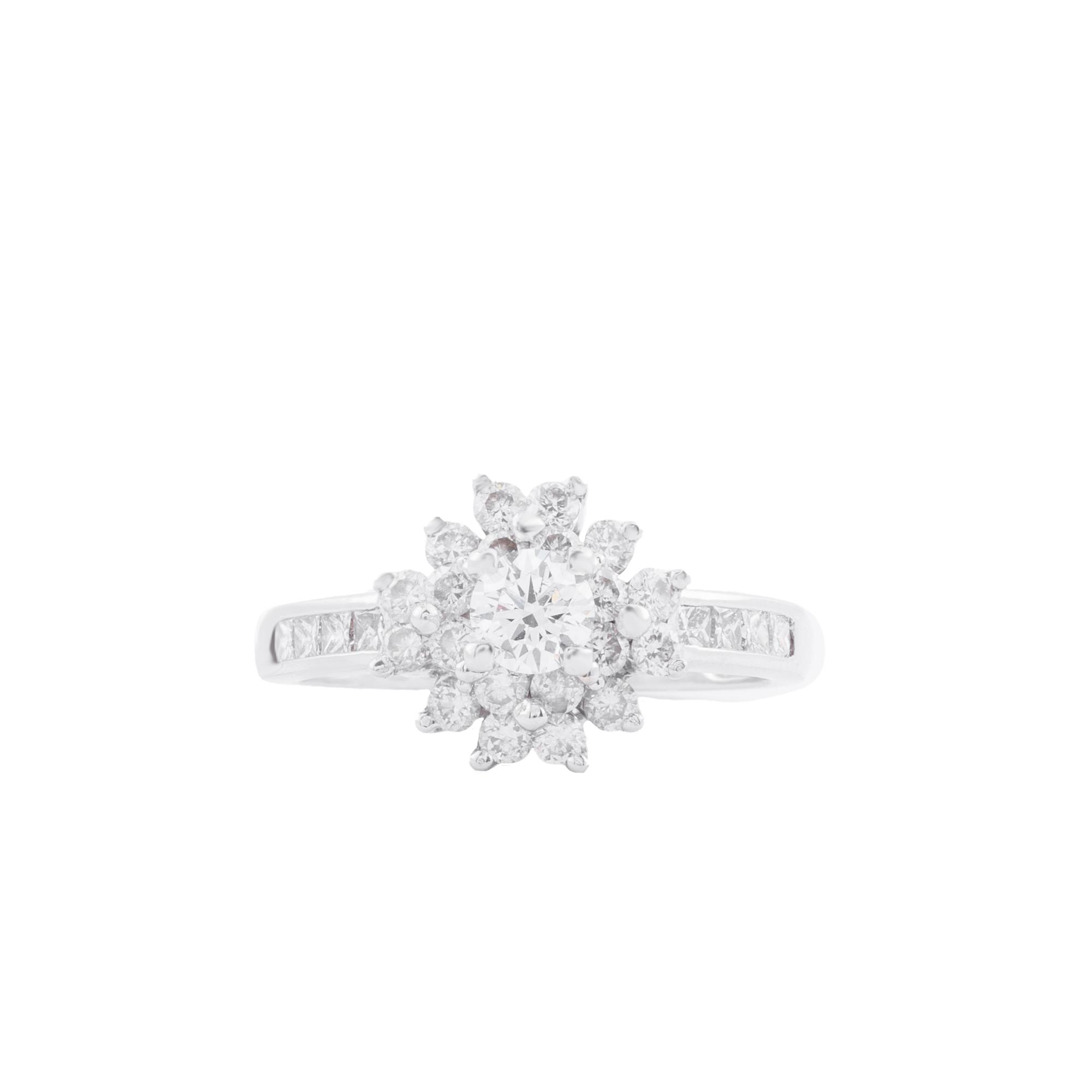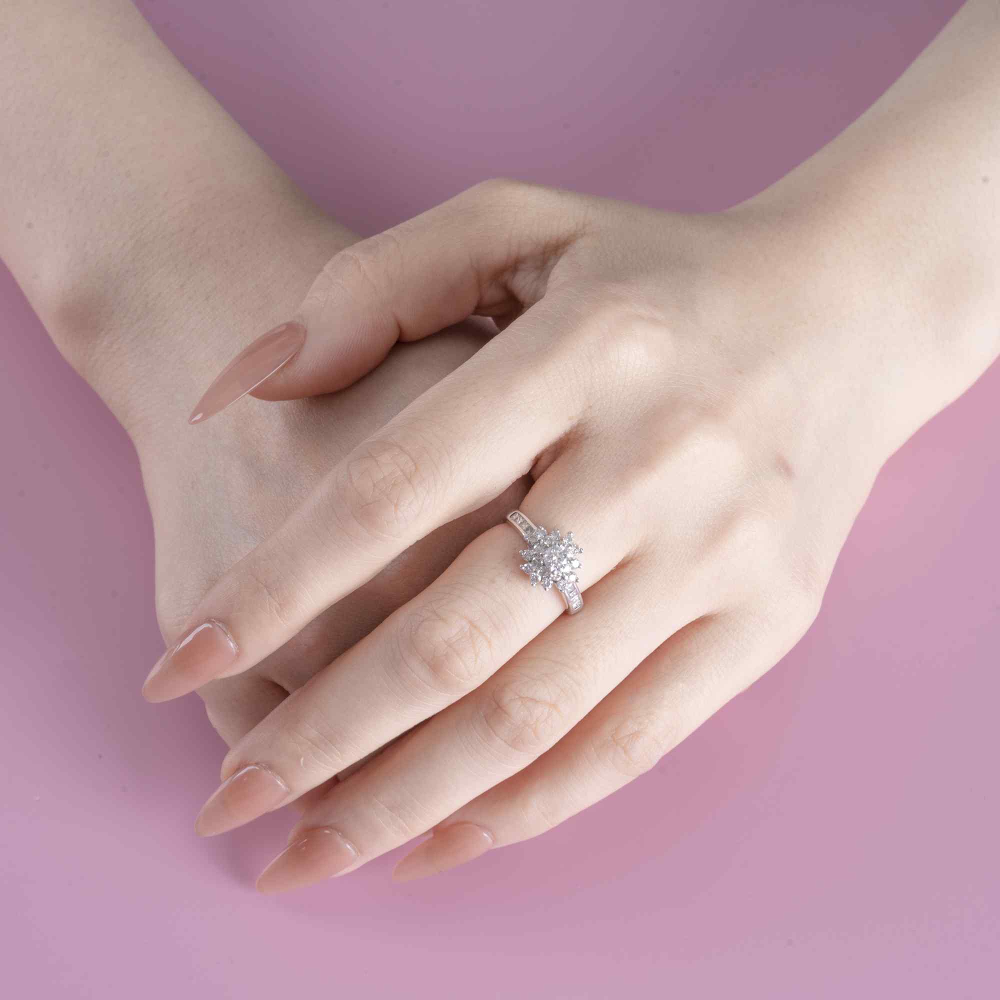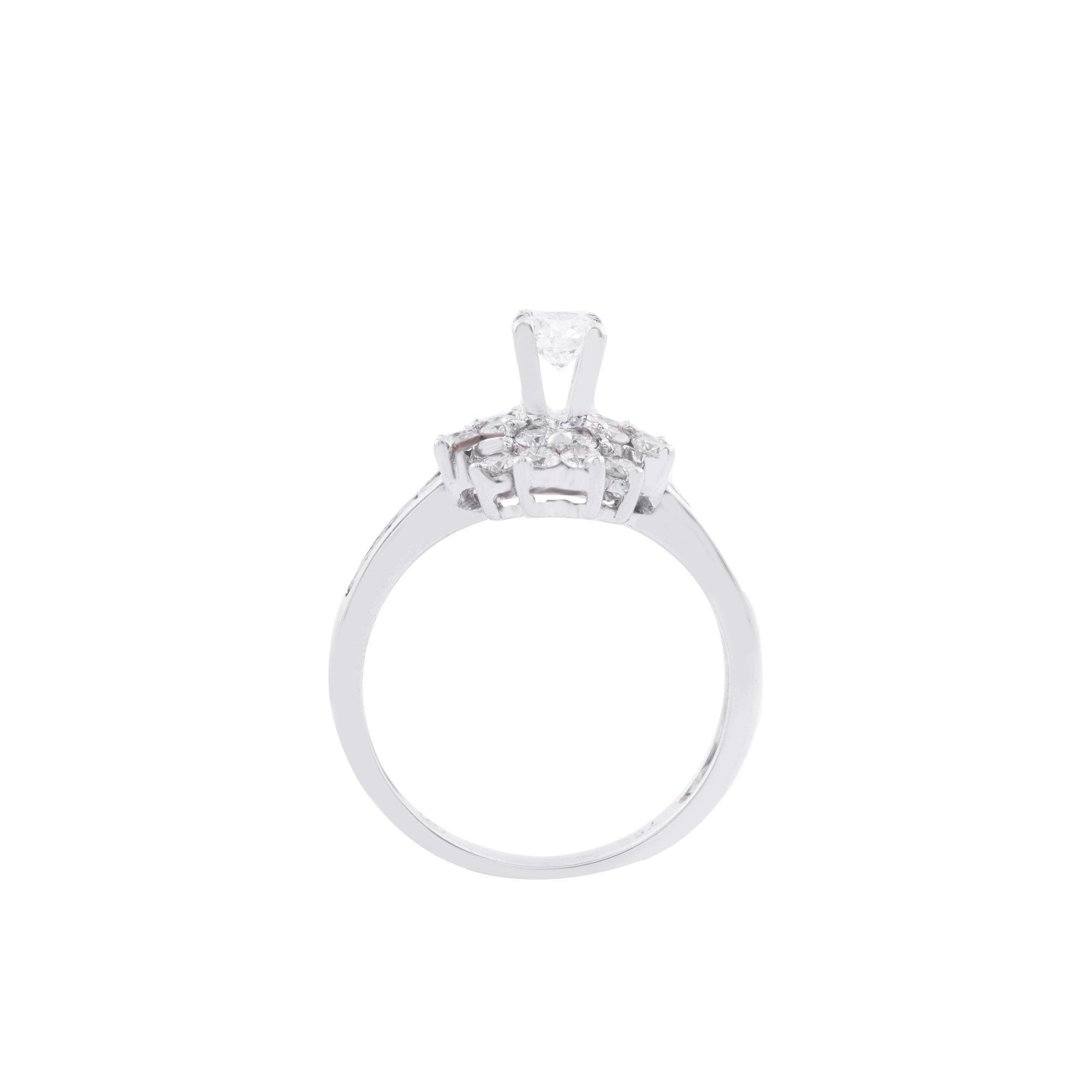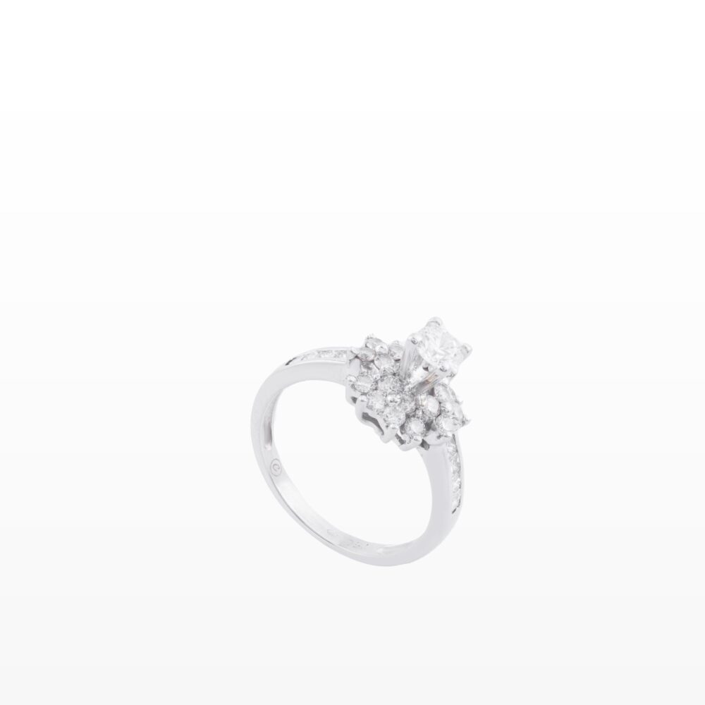 Chiếc nhẫn tựa như một đóa hoa kim cương đang bung nở trên đầu ngón tay, mang theo vẻ đẹp dịu dàng nhưng đầy mê hoặc. Viên kim cương trung tâm tỏa sáng rực rỡ, được bao quanh bởi những cánh hoa đính đá tinh xảo, xếp tầng hài hòa như từng lớp yêu thương chồng lên nhau.