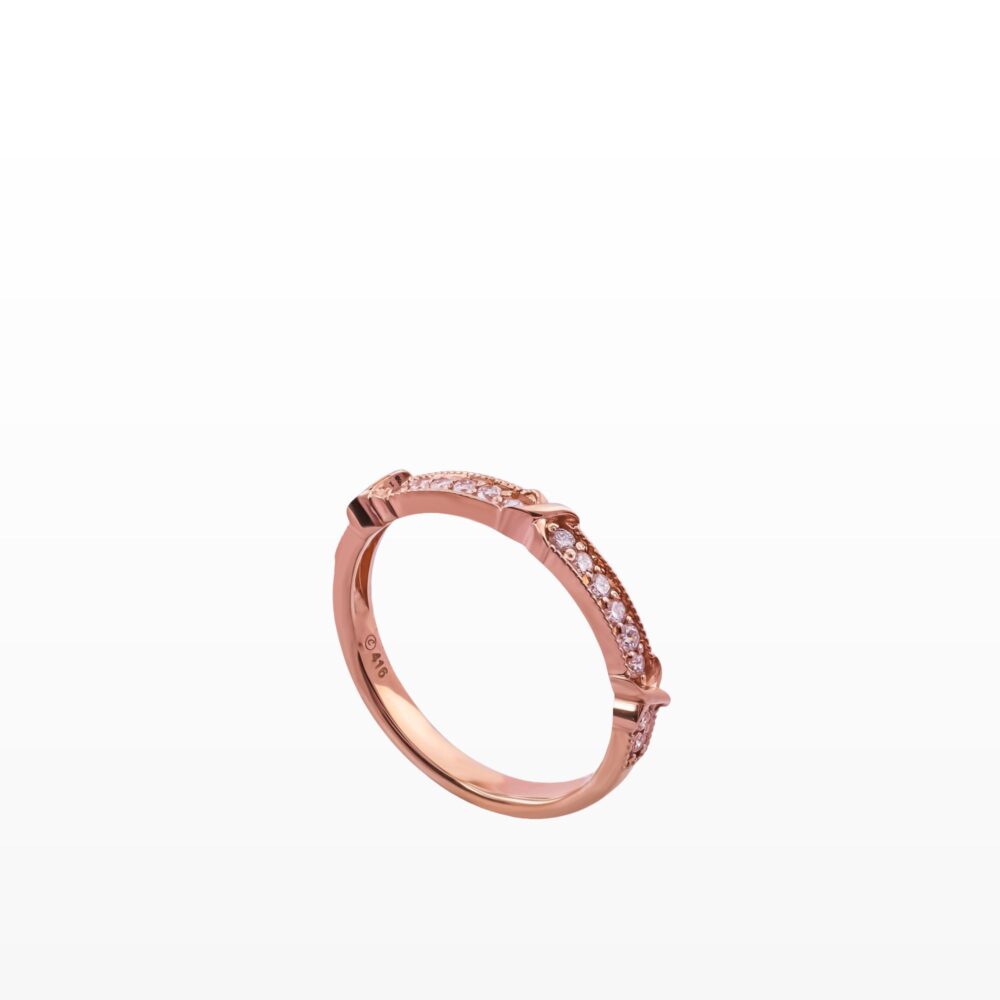 Sắc vàng hồng ấm áp ôm trọn bàn tay, mang lại cảm giác dịu dàng và nữ tính. Những viên kim cương nhỏ được sắp xếp khéo léo dọc thân nhẫn, lấp lánh như những khoảnh khắc hạnh phúc được gom góp theo năm tháng. Ánh sáng không phô trương, mà lan tỏa nhẹ nhàng, đủ để người đối diện cảm nhận được sự tinh xảo và gu thẩm mỹ tinh tế.