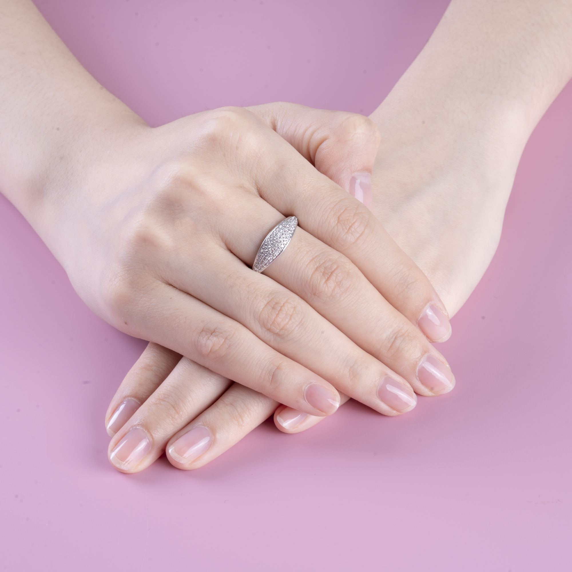 Chiếc nhẫn gây ấn tượng với thiết kế mặt marquise đầy thanh thoát, giúp tôn dáng ngón tay thon gọn và mềm mại hơn.