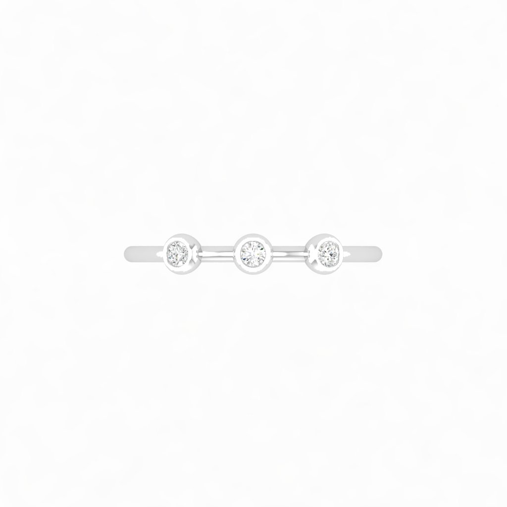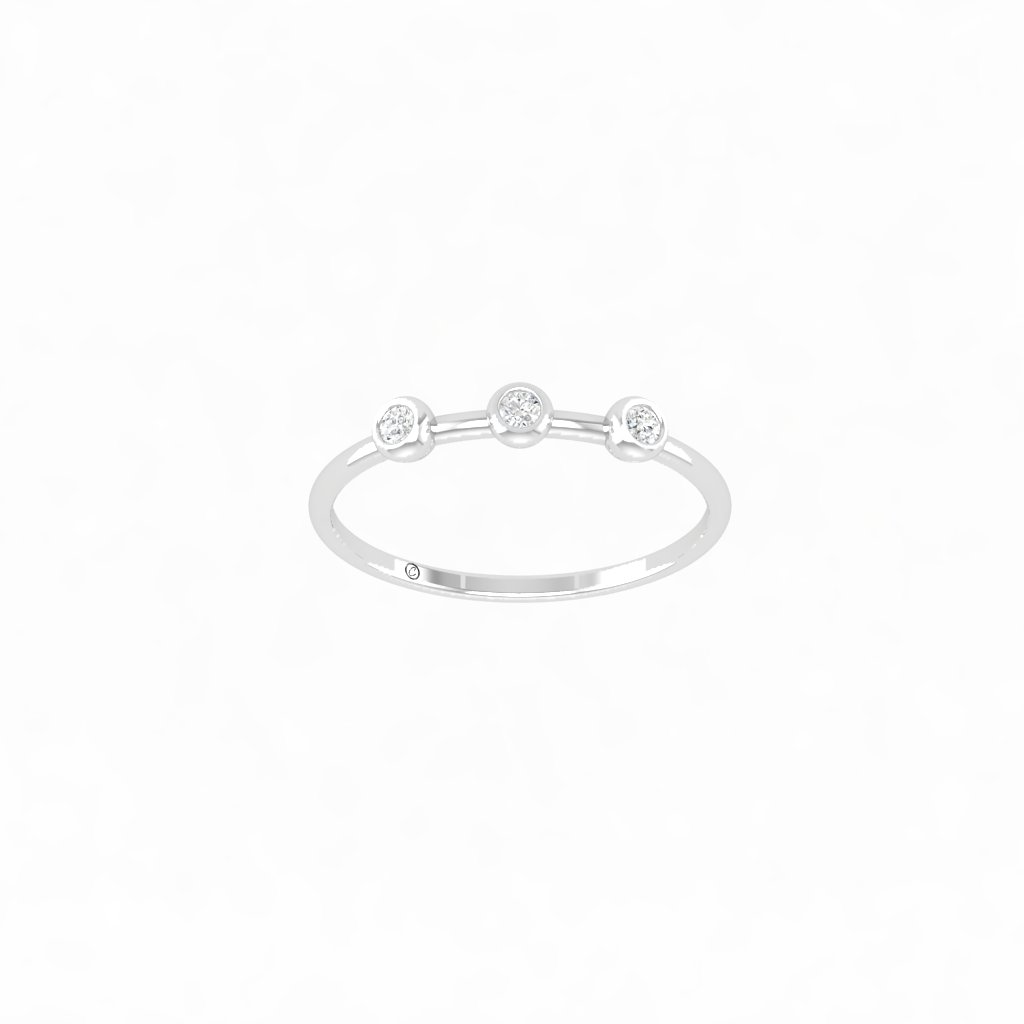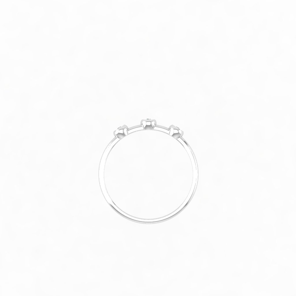 Chiếc nhẫn kim cương ba viên mang thiết kế thanh thoát và đầy cảm xúc. Ba viên kim cương nhỏ được đính khéo léo trên thân nhẫn như ba điểm sáng tinh tế, tượng trưng cho những khoảnh khắc yêu thương và sự gắn kết bền lâu.