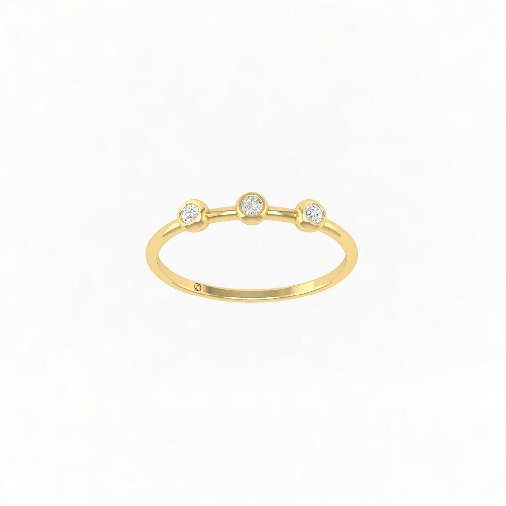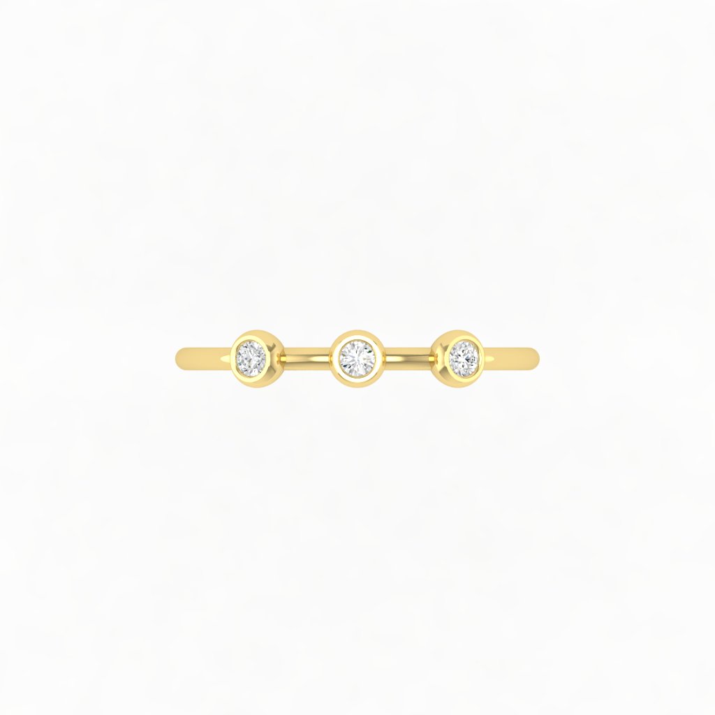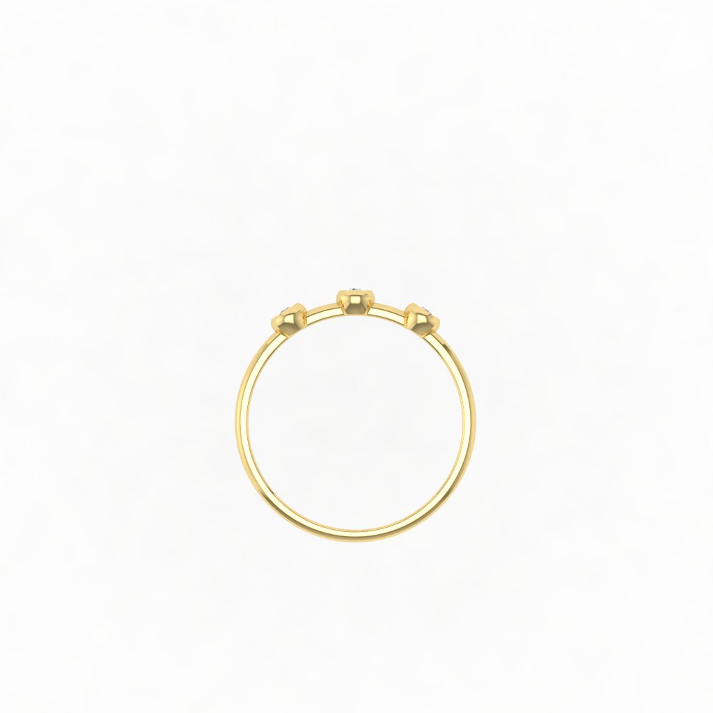 Chiếc nhẫn kim cương ba viên mang thiết kế thanh thoát và đầy cảm xúc. Ba viên kim cương nhỏ được đính khéo léo trên thân nhẫn như ba điểm sáng tinh tế, tượng trưng cho những khoảnh khắc yêu thương và sự gắn kết bền lâu.