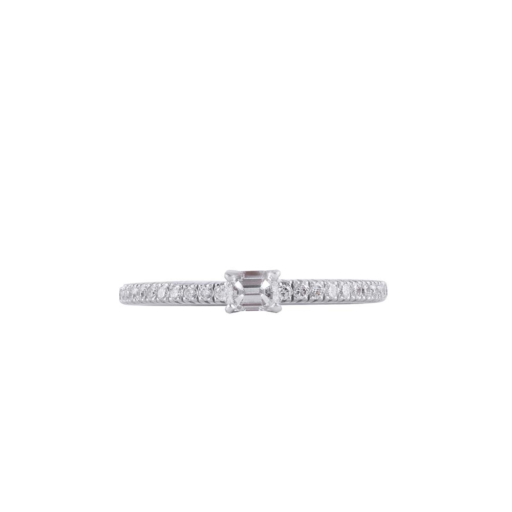 Thiết kế tinh tế và thanh lịch, chiếc nhẫn này nổi bật với viên kim cương trung tâm cắt kiểu Emerald hình chữ nhật, đem lại vẻ sang trọng và hiện đại. Hai bên là những viên kim cương nhỏ đính dọc theo vành nhẫn, tăng thêm độ lấp lánh và sự hoàn hảo cho tổng thể thiết kế.