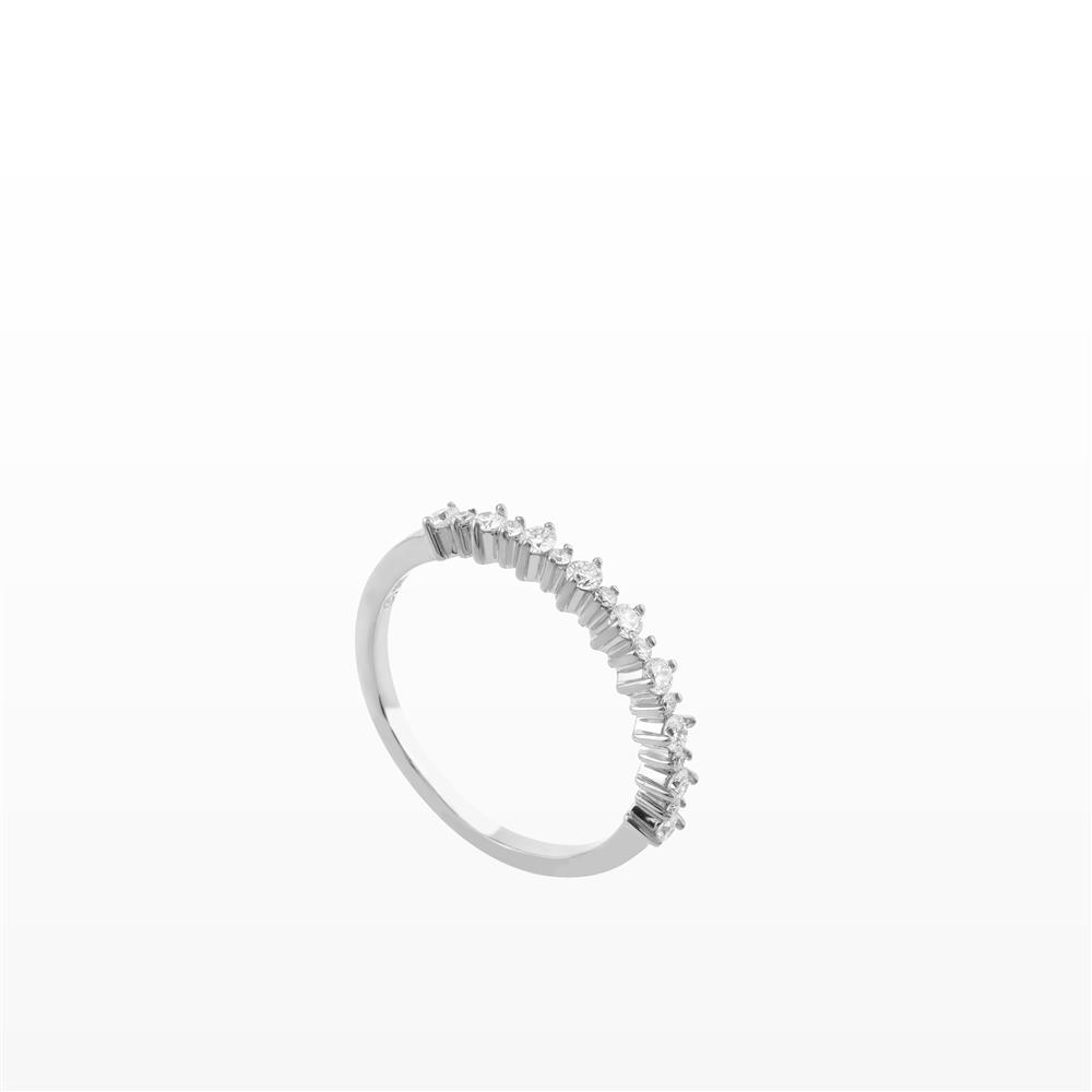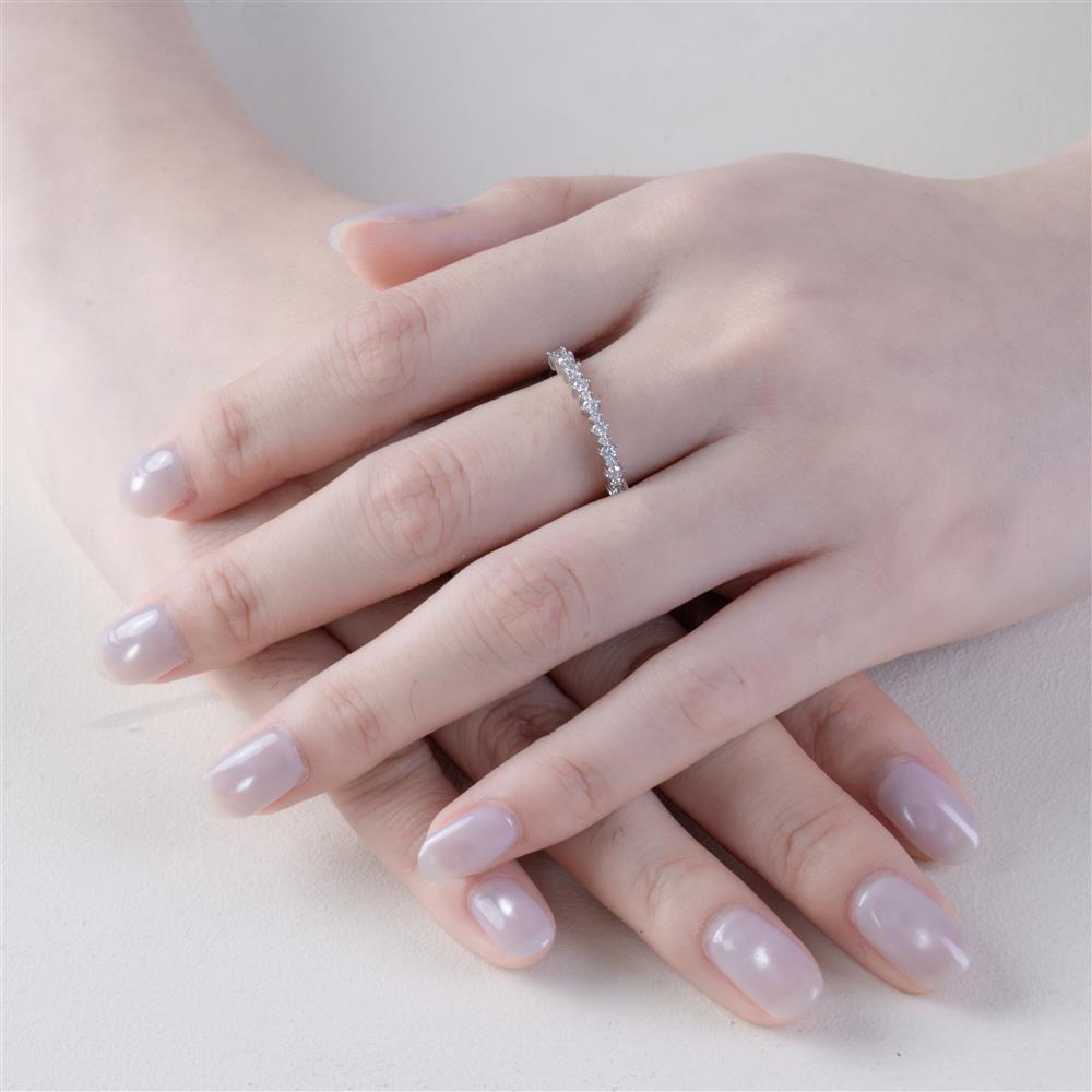 Nhẫn kim cương dáng eternity bán phần tỏa sáng vẻ đẹp tinh tế và thanh lịch khi được đeo trên tay, tạo điểm nhấn nhẹ nhàng nhưng đầy cuốn hút. Hàng kim cương nhỏ được sắp xếp đều đặn, ôm trọn đường cong ngón tay, mang lại hiệu ứng lấp lánh tự nhiên theo từng chuyển động.