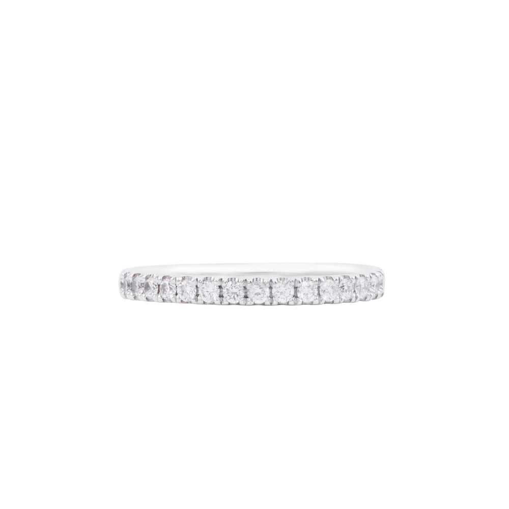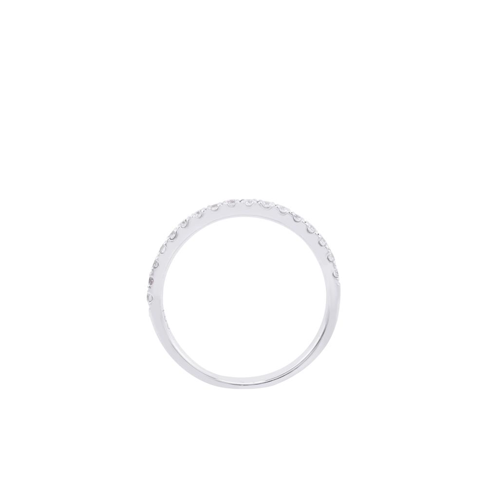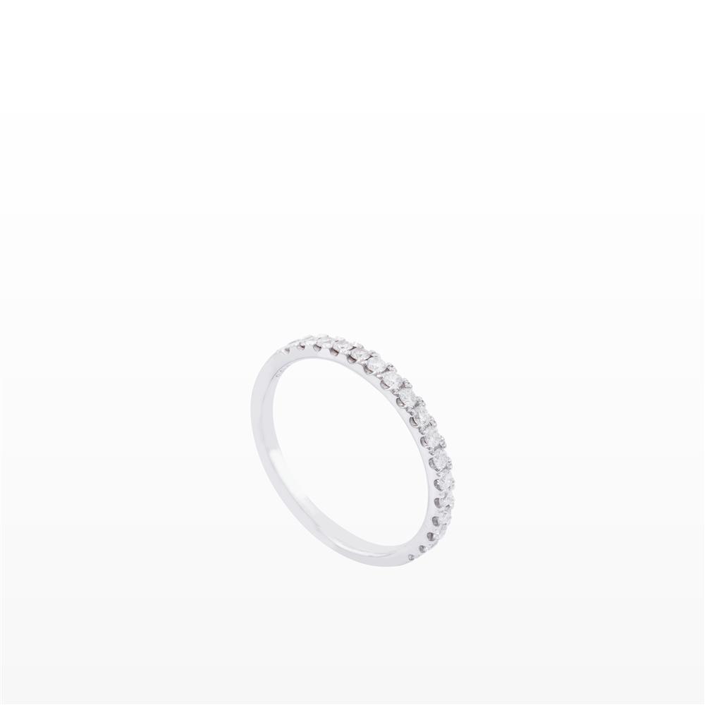 Chiếc nhẫn demi đính kim cương đều tăm tắp quanh thân, lấp lánh như một vòng sáng tinh khiết ôm trọn ngón tay. Thiết kế thanh mảnh nhưng nổi bật, phù hợp với mọi phong cách — từ nhẹ nhàng, nữ tính đến sang trọng, hiện đại.