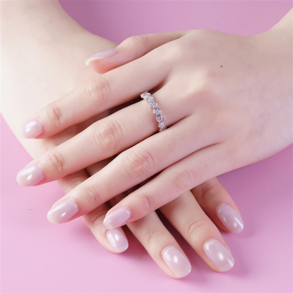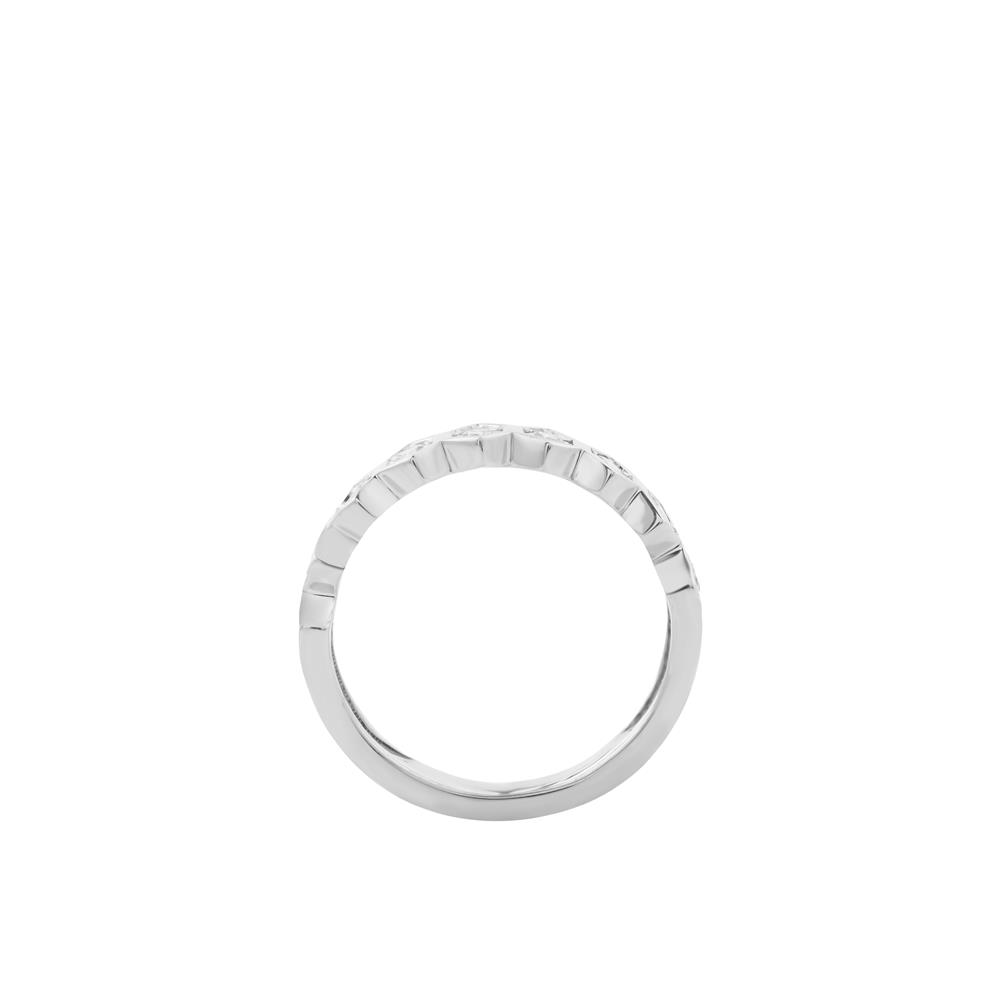 Nhẫn kim cương gây ấn tượng với thiết kế eternity liền vòng, nổi bật bởi họa tiết zigzag hình học bao quanh từng viên kim cương. Các viên đá được đặt trong khung bo cạnh sắc nét nhưng vẫn mềm mại, tạo hiệu ứng lấp lánh liên tục và chiều sâu thị giác rất hiện đại.