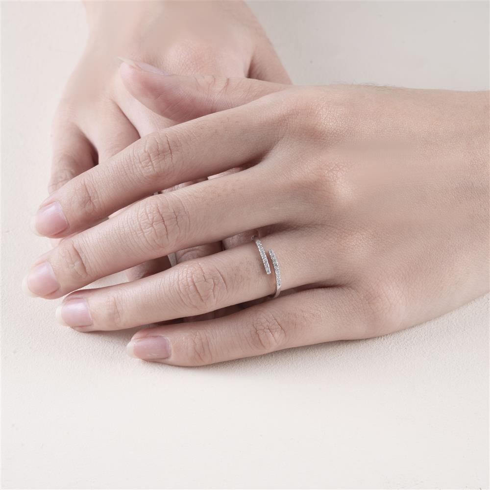 Chiếc nhẫn kim cương sở hữu thiết kế mở hiện đại, với hai dải kim cương nhỏ được đính tinh tế ở hai đầu, tạo điểm nhấn thanh thoát và trẻ trung. Đường nét gọn gàng, tinh giản nhưng vẫn mang lại hiệu ứng ánh sáng lấp lánh, giúp nhẫn trở nên nổi bật theo cách nhẹ nhàng và sang trọng.