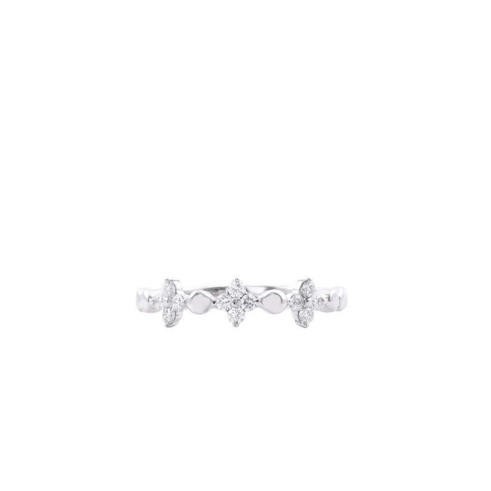 Thiết kế nhẫn gây ấn tượng với chuỗi họa tiết hoa nhỏ đính kim cương được sắp xếp nhịp nhàng quanh thân nhẫn, tạo cảm giác như những đóa hoa đang nở rộ liên tiếp. Xen kẽ giữa các cụm hoa là chi tiết bo tròn mềm mại, giúp tổng thể trở nên uyển chuyển, hài hòa và giàu chiều sâu thị giác.