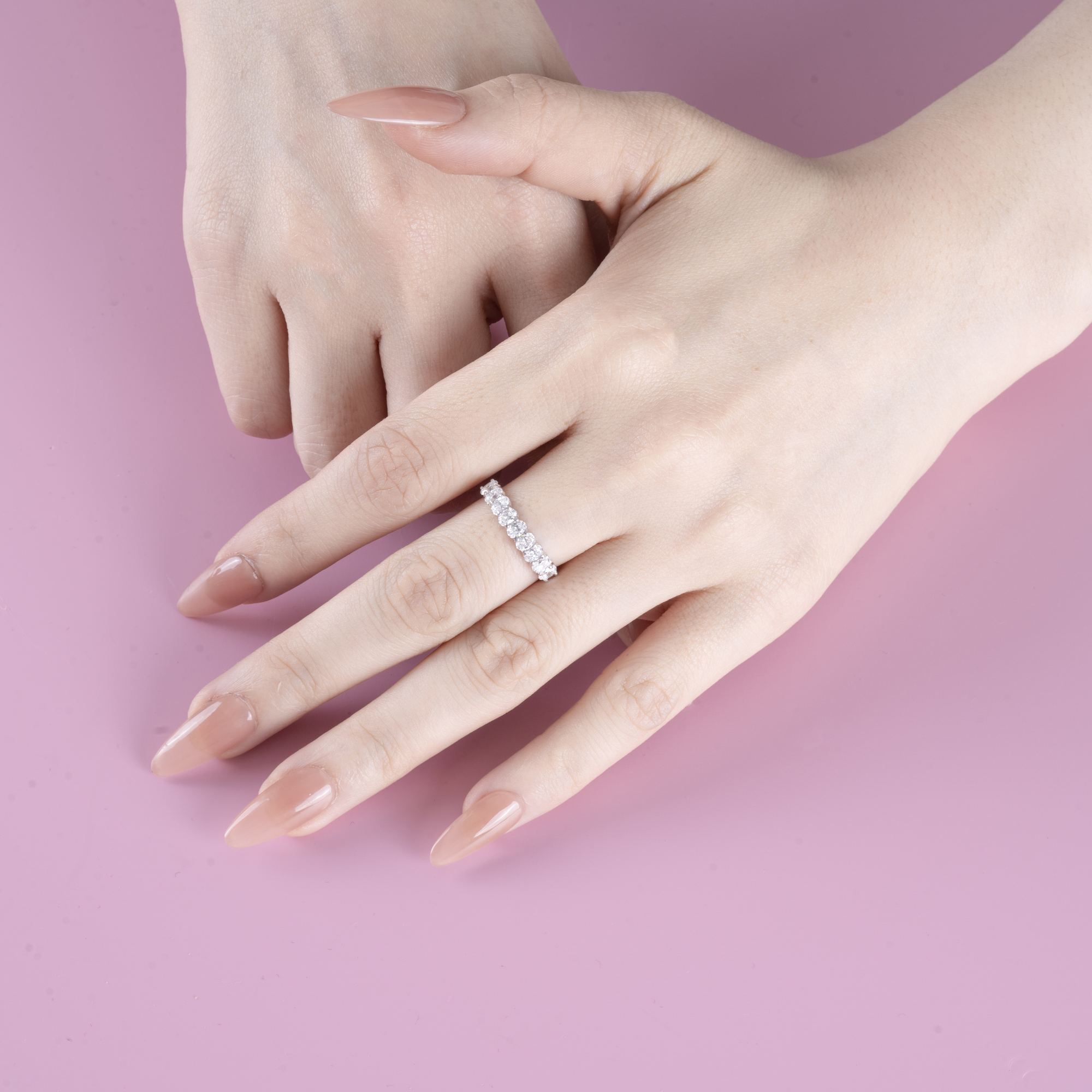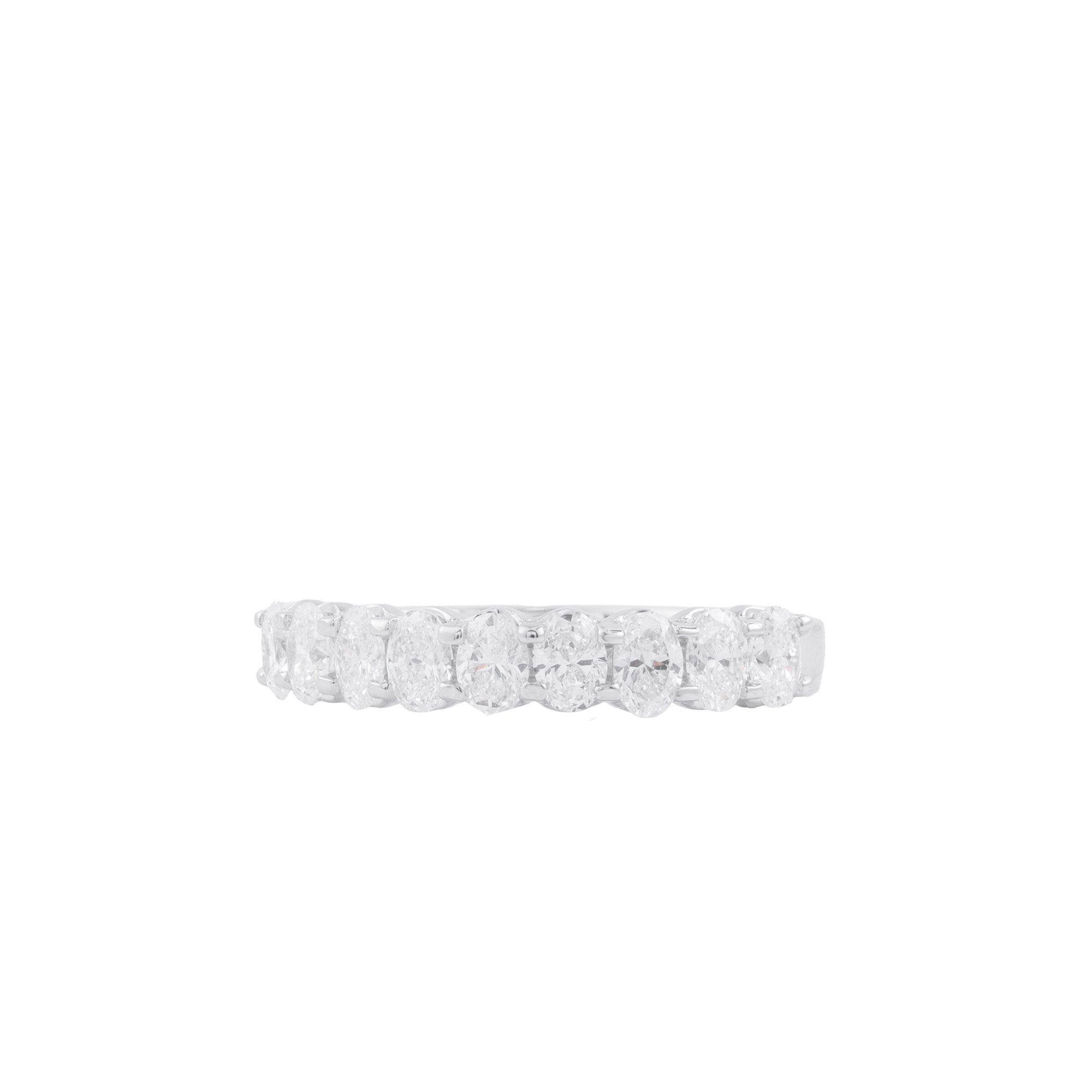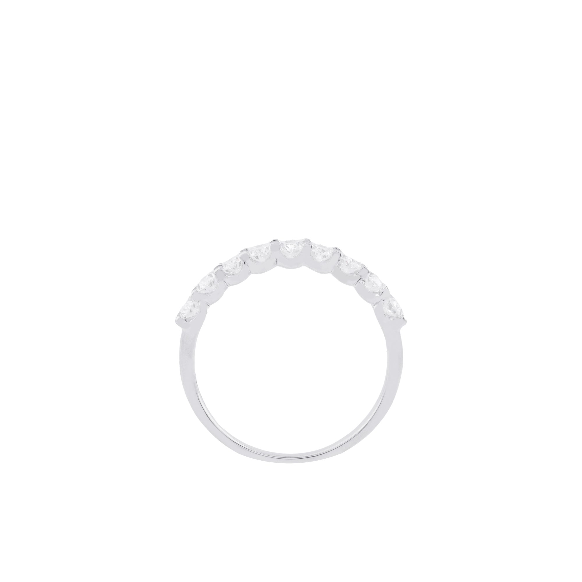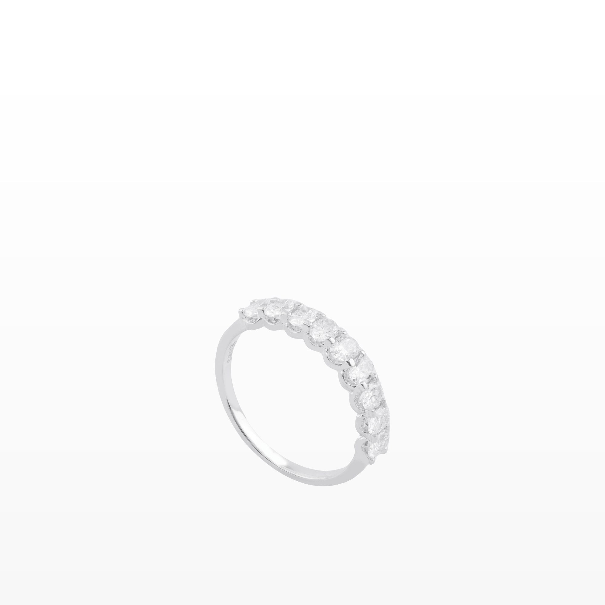 Mỗi viên kim cương tỏa ra ánh sáng riêng, khi kết hợp lại tạo nên một dải lấp lánh sâu thẳm, gợi cảm giác huyền bí và đầy quyến rũ. Thiết kế nửa vòng tinh tế giúp nhẫn vừa nổi bật, vừa giữ được sự cân bằng hoàn hảo giữa vẻ đẹp hiện đại và nét cổ điển vượt thời gian.