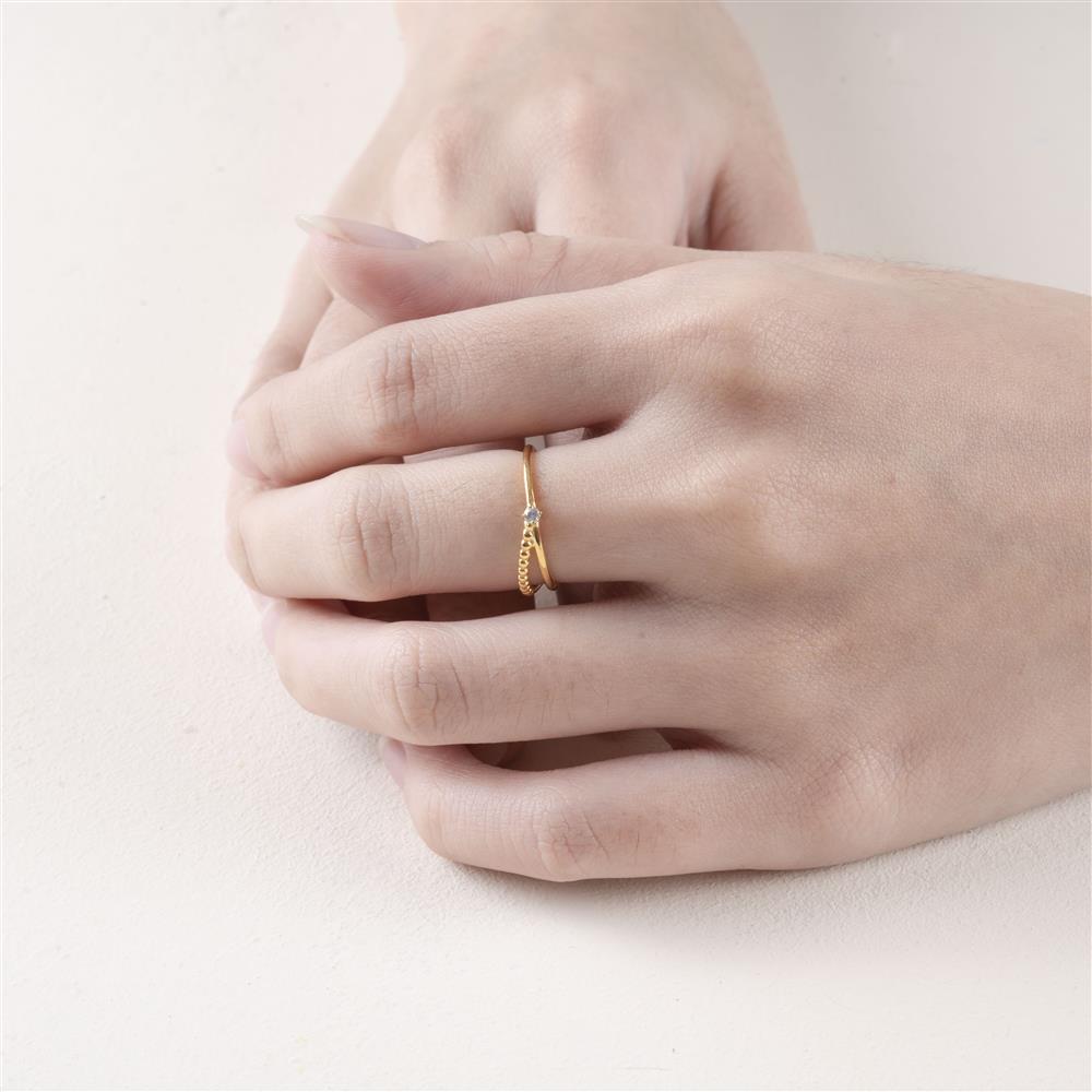 Thiết kế nhẫn mang cảm giác êm ái và nữ tính, với đường đai mảnh khẽ nâng viên kim cương nhỏ lấp lánh như một điểm sáng tinh khôi. Phía dưới, chuỗi hạt tròn đều xếp liền mạch tạo nên nhịp điệu mềm mại, gợi cảm giác chuyển động nhẹ nhàng theo từng cử chỉ của bàn tay.