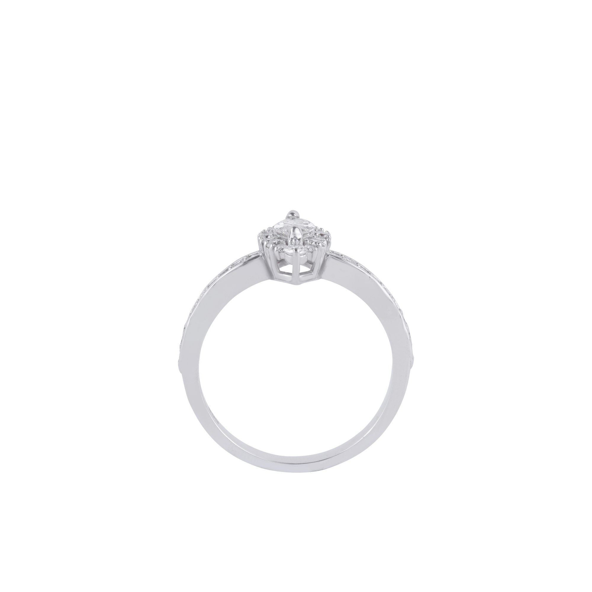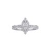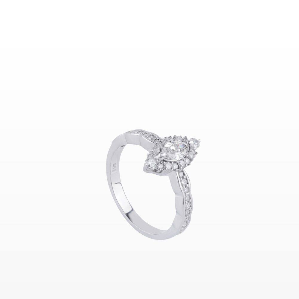 Mang vẻ đẹp độc đáo từ viên kim cương dáng marquise được bao quanh bởi vòng đá tấm tinh xảo, mẫu nhẫn gây ấn tượng nhờ thiết kế thân nhẫn phá cách, đính đá theo đường cong uốn nhẹ. Sự kết hợp hài hòa giữa nét cổ điển và hiện đại tạo nên một thiết kế trang sức vừa thanh lịch vừa cá tính, lý tưởng cho những quý cô yêu thích sự khác biệt.