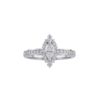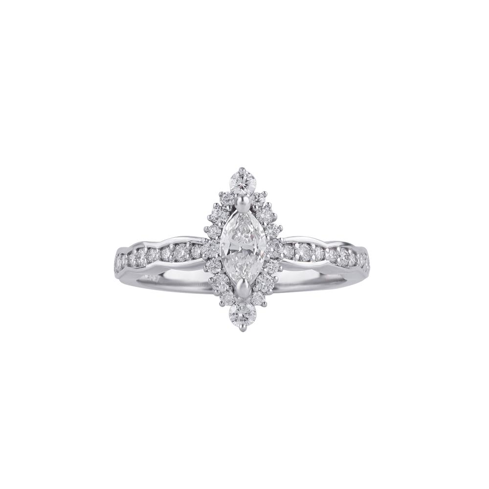 Mang vẻ đẹp độc đáo từ viên kim cương dáng marquise được bao quanh bởi vòng đá tấm tinh xảo, mẫu nhẫn gây ấn tượng nhờ thiết kế thân nhẫn phá cách, đính đá theo đường cong uốn nhẹ. Sự kết hợp hài hòa giữa nét cổ điển và hiện đại tạo nên một thiết kế trang sức vừa thanh lịch vừa cá tính, lý tưởng cho những quý cô yêu thích sự khác biệt.