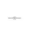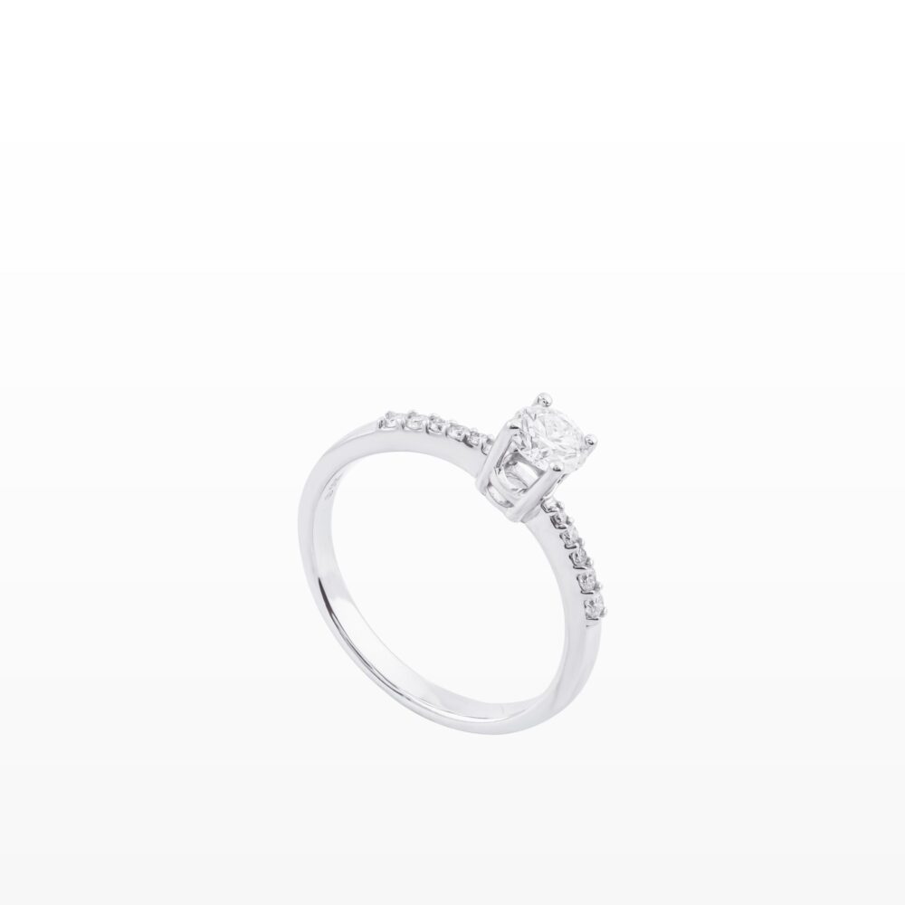 Nhẫn kim cương vàng trắng nổi bật với viên kim cương chủ được nâng cao bởi bộ chấu thanh mảnh, giúp ánh sáng phản chiếu rực rỡ. Thân nhẫn đính kim cương tấm tinh tế hai bên, tạo tổng thể sang trọng, thanh lịch và cuốn hút cho bàn tay.