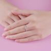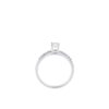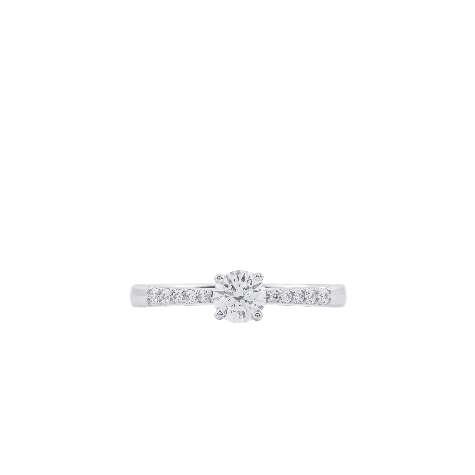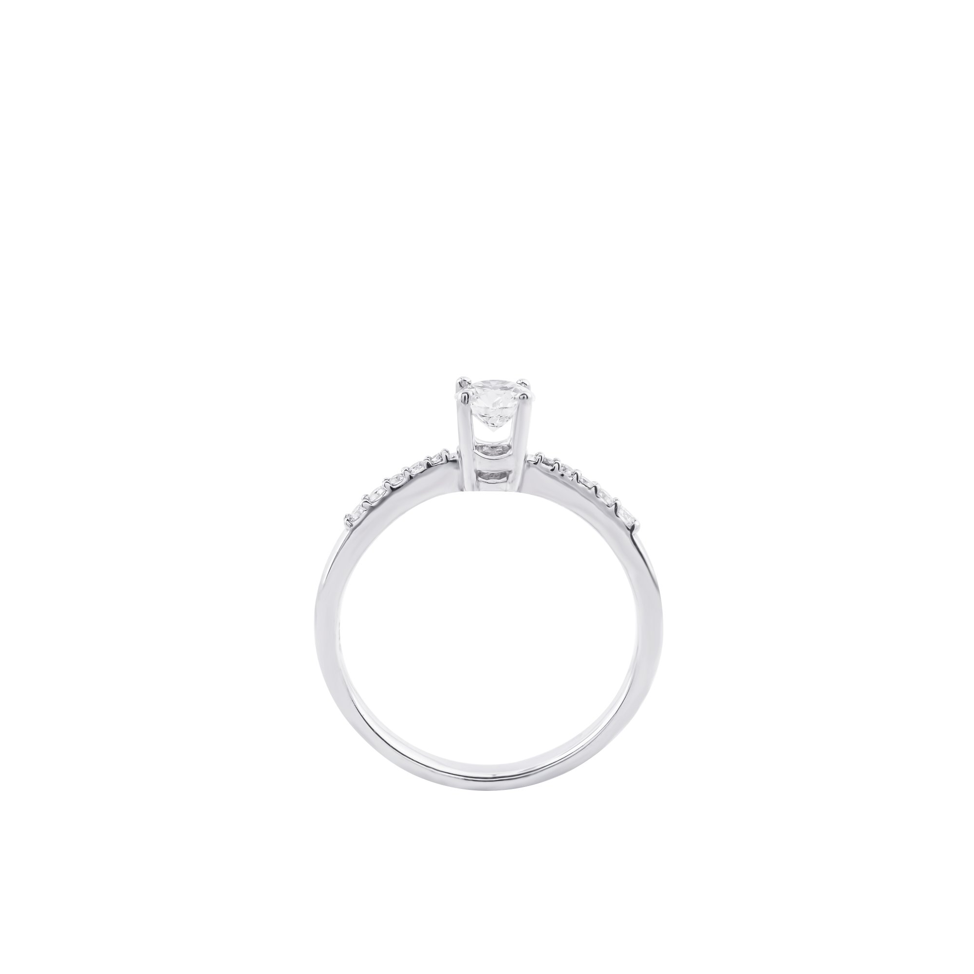 Nhẫn kim cương vàng trắng với thiết kế chấu cao thanh mảnh, tôn trọn vẻ rực rỡ của viên kim cương chủ. Hai hàng kim cương tấm chạy dọc thân nhẫn tạo hiệu ứng lấp lánh tinh tế, mang đến tổng thể sang trọng, hiện đại và đầy cuốn hút cho bàn tay.